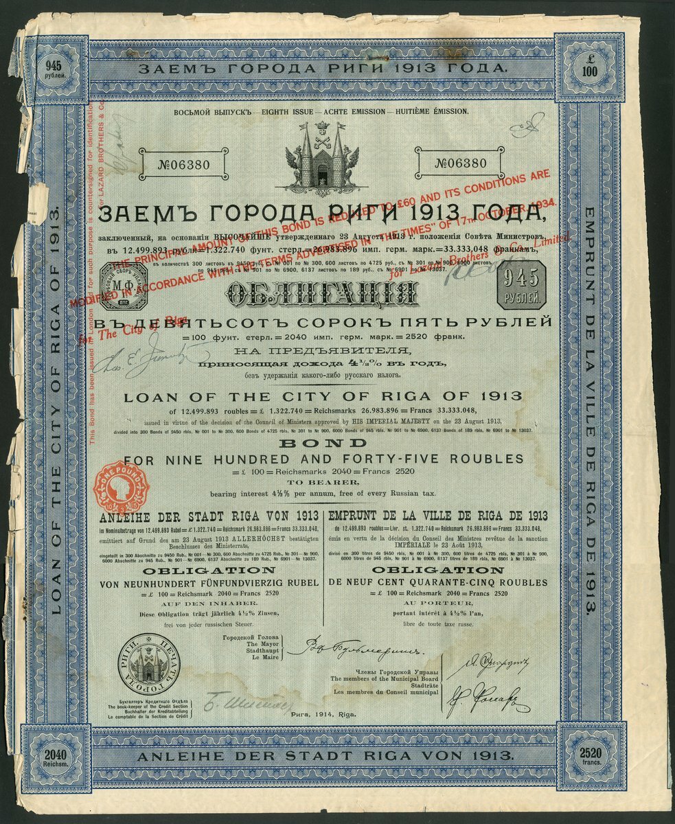 Russia/Latvia: City of Riga, 4½% Loan, 1913, bond for 945 roubles or £100, #6380, dated 1914, arms at top, blue and black, endorsement in red of reduction of nominal value to £60 in 1934, lacks coupons but with 1959 declaration certificate. Top and left edges a little ragged, F-VF and scarce.