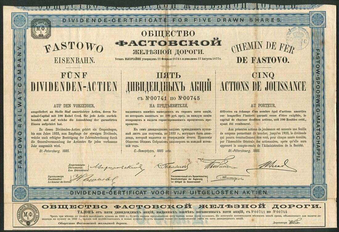Russia: Fastovo Railway, 5 x jouissance shares, St.Petersburg 1885, #00741-745, blue and black, text in Russian, German and French, with coupons. Heavy centre fold but F-VF and rare.