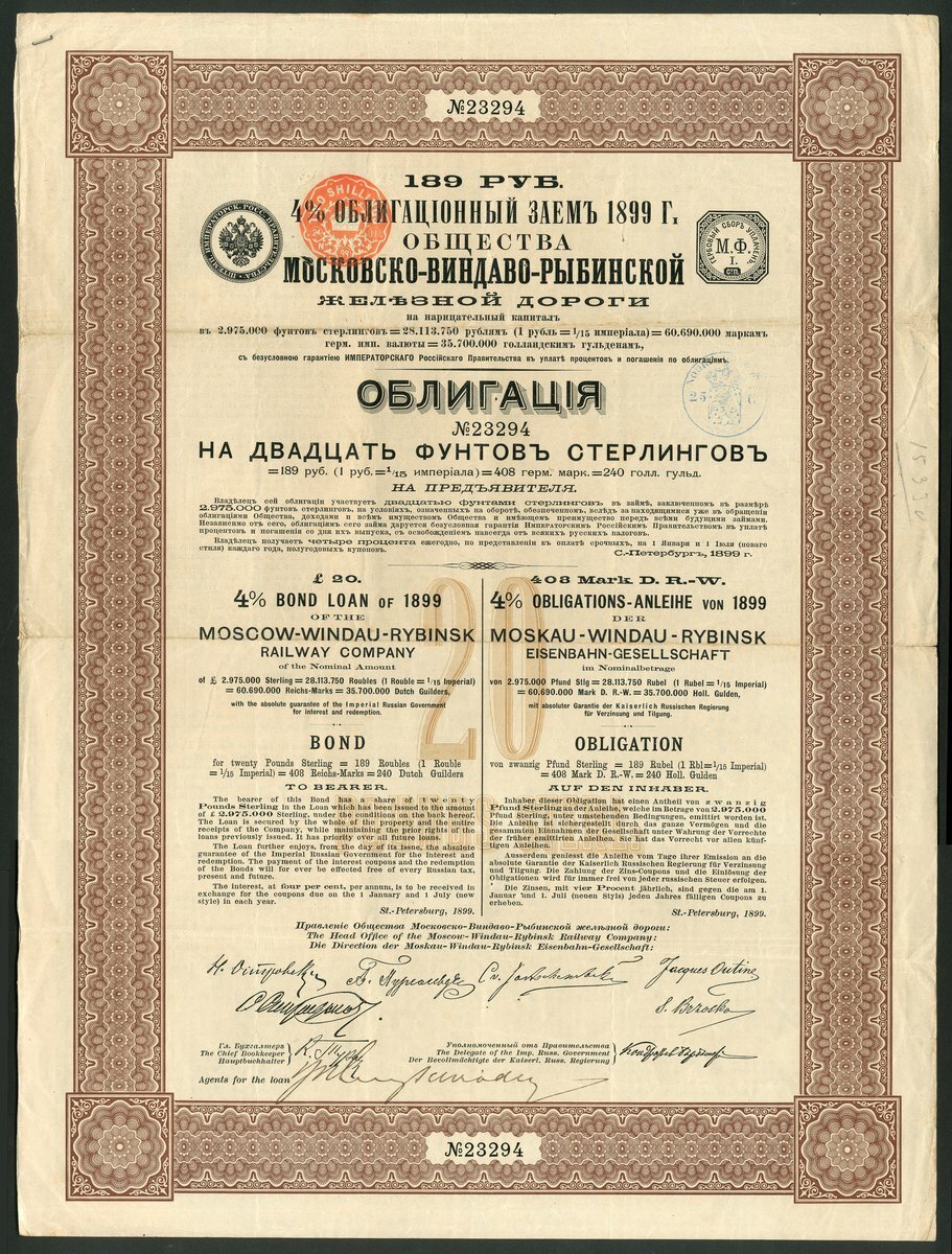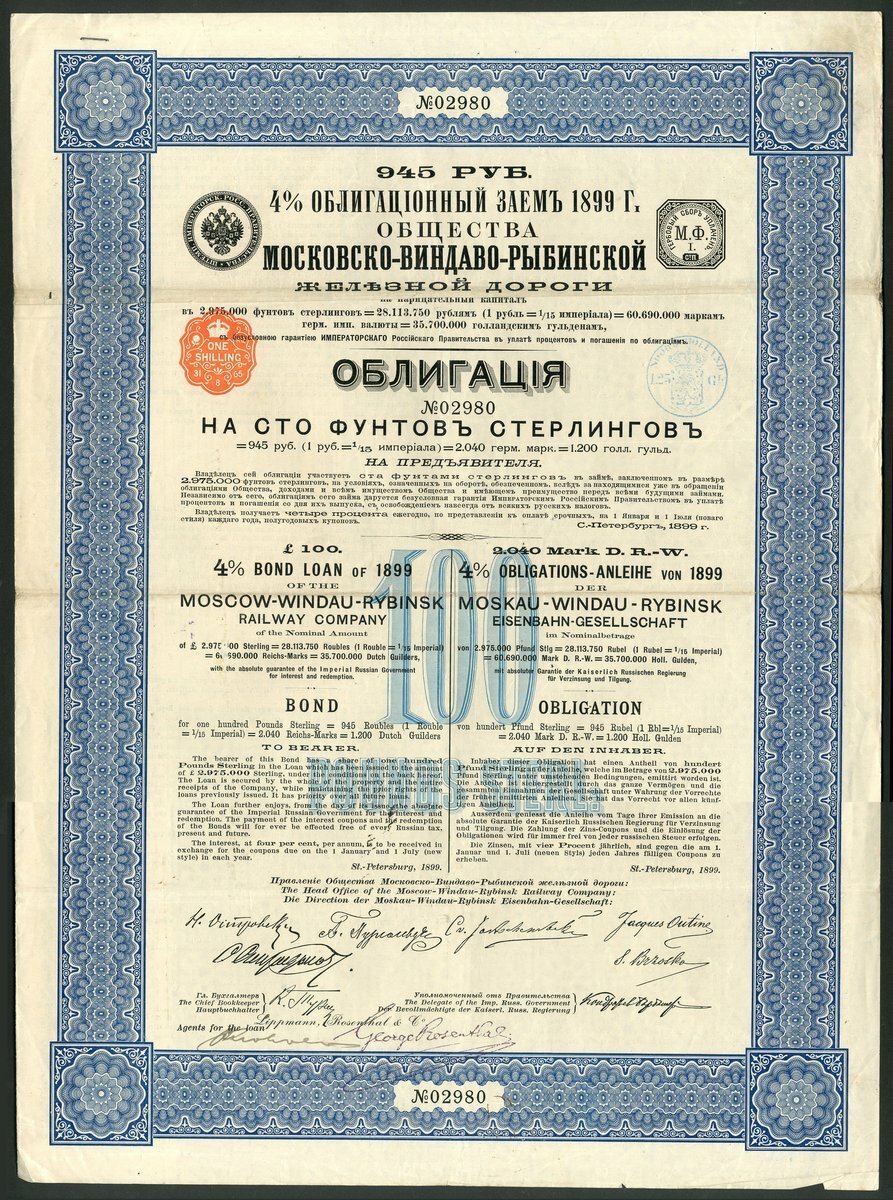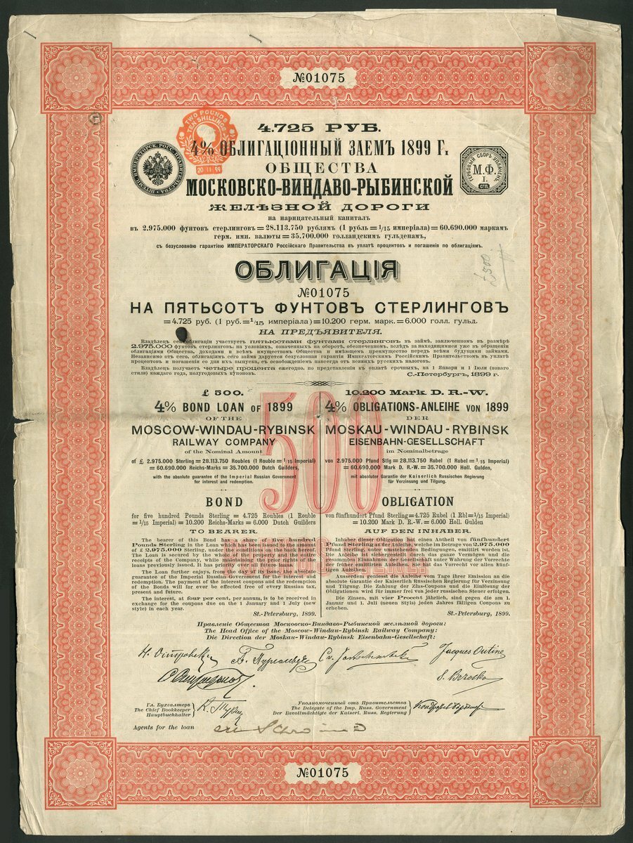 Russia: Moscow Windau Rybinsk Railway, 4% Loan, 1899, part set of bonds for £500, £100 and £20, red, blue and brown respectively, with coupons. The first creased, fine, otherwise F-VF (3).