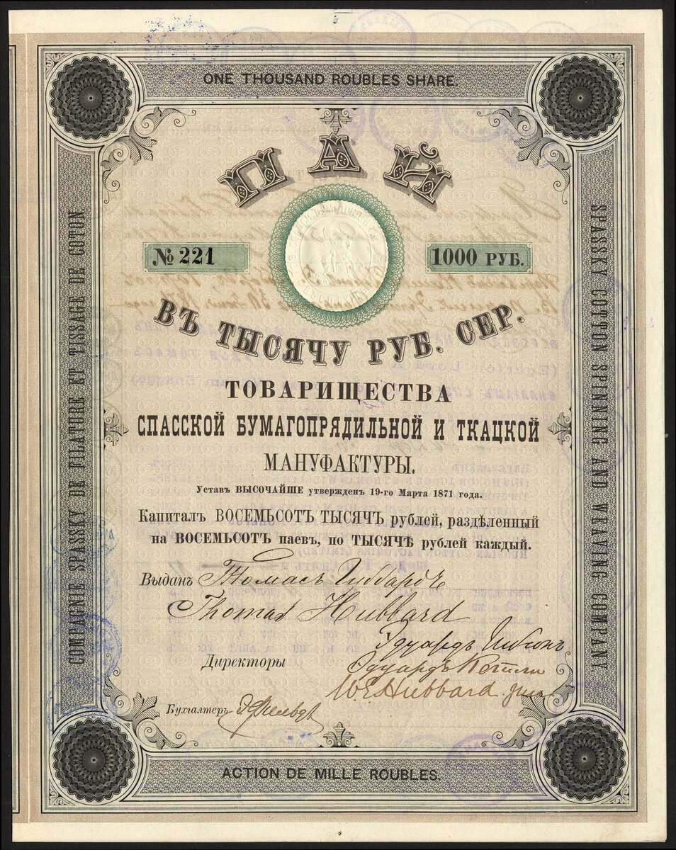 Russia: Spassky Cotton Spinning and Weaving Co., 1000 rouble share, 1871, #221, issued to Thomas Hubbard and signed by W.E.Hubbard jnr as director, ornate border with scrollwork in each corner, grey and green, 4 pages, the reverse showing dividends paid to 1915/16. Owned and controlled by the English Anglo-Russian Cotton Factories Ltd. and the Hubbard family. William Hubbard settled in St.Petersburg in 1769 and some years later was a member of the giant Russia Company. He and his sons carried on a general trading business but in the 1840's built a large cotton spinning and weaving factory in the Alexandroff district. A company was formed in 1851 which was very successful operating over 1200 looms during the Crimean War. In 1866 the Hubbards bought the derelict Schlusselburg Calico Printing Works and re-equipped it with modern machinery and then acquired the Spassky Mill which had over 800 employees in the 1870's. John Hubbard, head of the firm, was created Baron Addington in 1887 and was also a Governor of the Bank of England. EF and scarce.