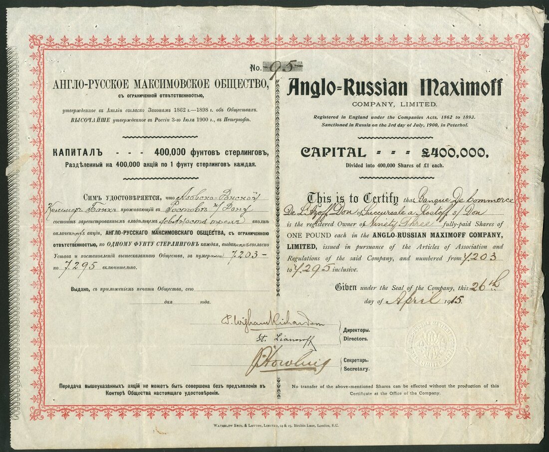 Russia: Anglo Russian Maximoff Co. Ltd., £1 shares, 190[15], #95, signed by E. Lianosoff as director, ornate border, red and black with text in both Russian and English, printed by Waterlow, Bros. & Layton. Owns oil well in Terek, Russia. VF and rare. The only known piece which was sold by us for £200 in 2014.