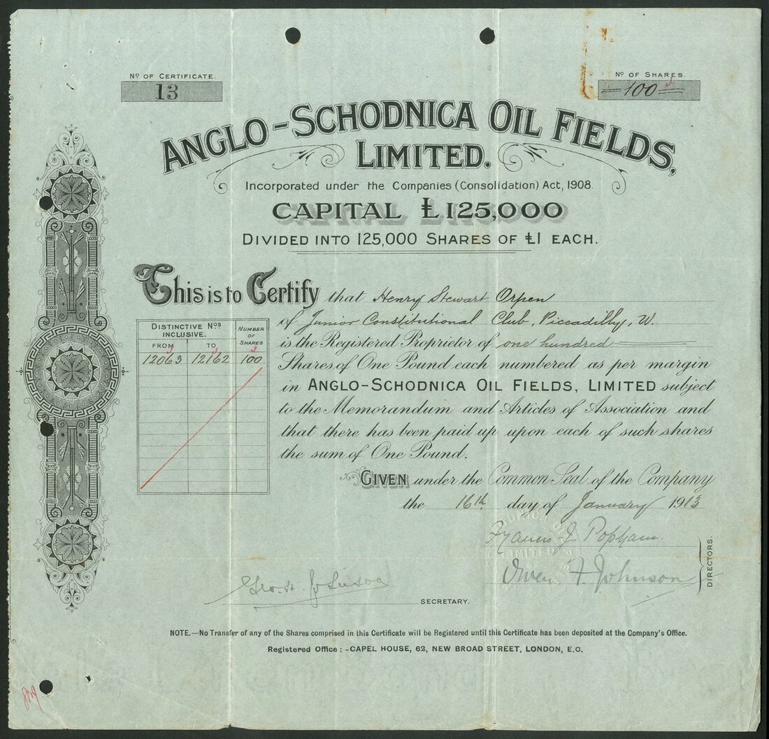 Russia - Ukraine: Anglo-Schodnica Oil Fields Limited, £1 shares, 19[13], #13, black on grey paper. Filing holes at top and left. VF and rare, not offered by us before.