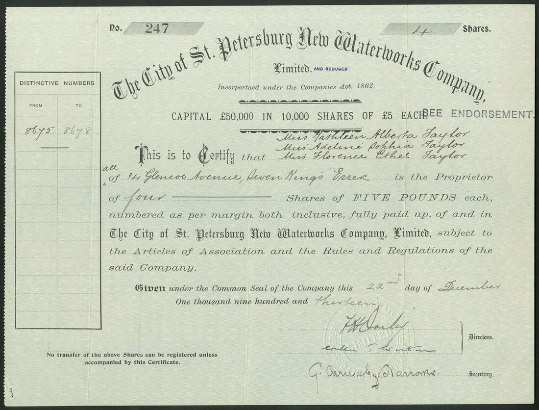 Russia: City of St.Petersburg New Waterworks Co. Ltd., £5 shares, 19[13], #247, black. GVF and rare. First time offered by us.