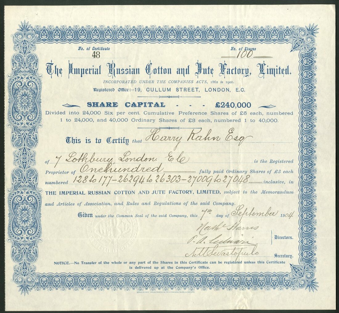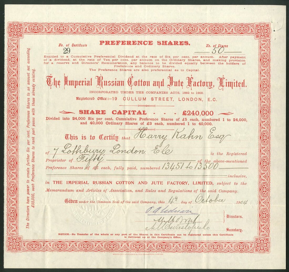 Russia: Imperial Russian Cotton and Jute Factory Limited, pair of certificates for £5 preference shares, #29, red and £3 ordinary shares, #48, blue, both issued to the same shareholder and dated 19[04]. VF and rare (2).