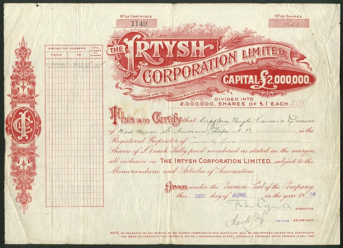 Russia: Irtysh Corporation Limited, £1 shares, 19[16], #1149, red. A large company which owned debentures in the Russo-Canadian Development Corporation which owned all shares in the Ridder Mining Company, a Russian corporation owning a concession in the Altai District of over 1600 square miles, and the Kirgiz Mining Company, also a Russian corporation which owned the Ekibastous Coalfield. VF and rare.