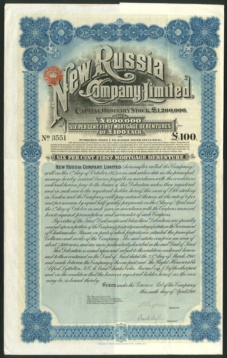 (x) Russia: New Russia Company Ltd., 6% first mortgage debenture, £100, 1910, #3551, large format piece with ornate border, blue and black, printed by Waterlow & Sons, with coupons. Registered 1869 by Welshman, John Hughes, to operate heavy industries in the Ukraine. The town which grew around the factories was known as Hughesovska and the company was nationalised by the Soviet Government. GVF.