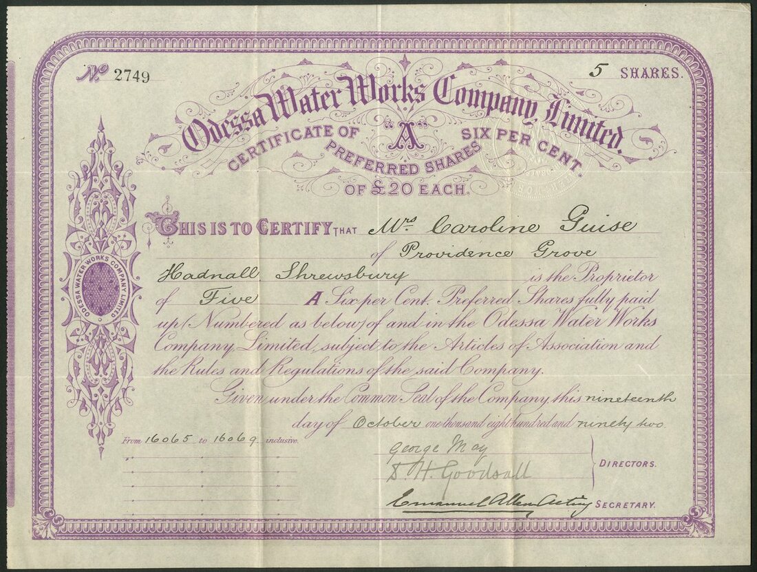 Russia: Odessa Water Works Company Limited, £20 6% 'A' preferred shares, 18[92], #2749, ornate border and scrollwork, mauve. First time offered by us. GVF and rare.