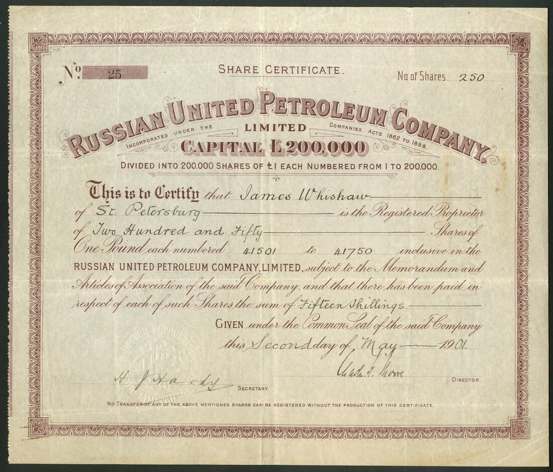 Russia: Russian United Petroleum Co. Ltd., £1 shares, 19[01], #25, brown. VF and rare.