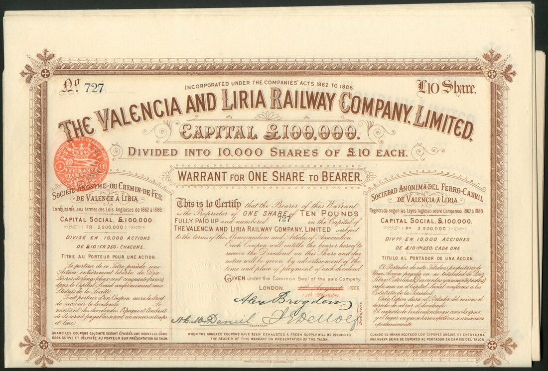 Spain: Valencia and Liria Railway Co. Ltd., a group of 10 certificates for one share of £10, London 1888, #727 through 736, ornate border, brown, text in English, French and Spanish, with coupons. EF (10).