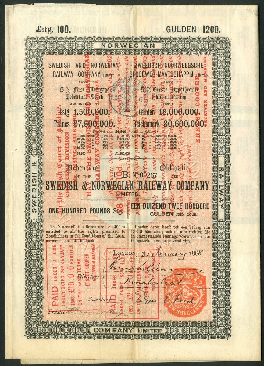 (x) Sweden/Norway: Swedish and Norwegian Railway Company, 5% First Mortgage Debenture for £100, London 188[8], #9267, interesting format text in 2 languages on both sides, black, red underprint, with coupons, endorsements on face. VF and scarce.