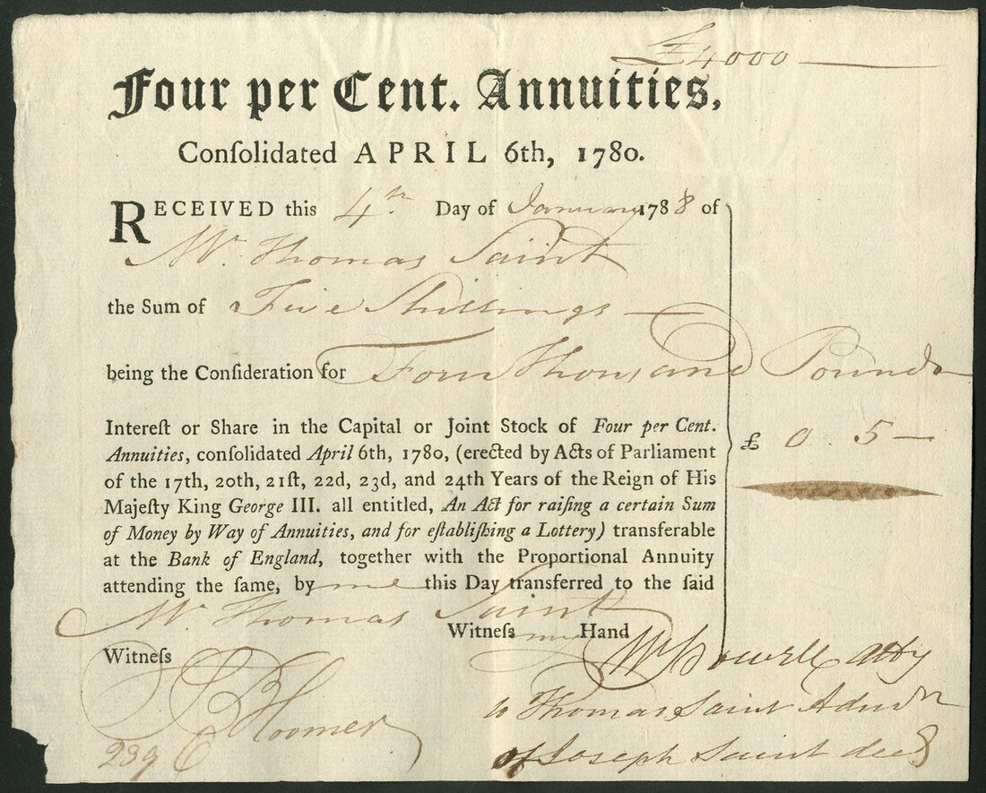 Great Britain: Four per Cent. Annuities, an inscribed stock receipt for £[4000] stock dated 178[8], black printing. Formed by consolidation of earlier issues in 1780 under an Act for 'raising a certain Sum of Money by Way of Annuities, and for establishing a Lottery'. Usual spiking damage at lower left corner but a rare early date, VF.
