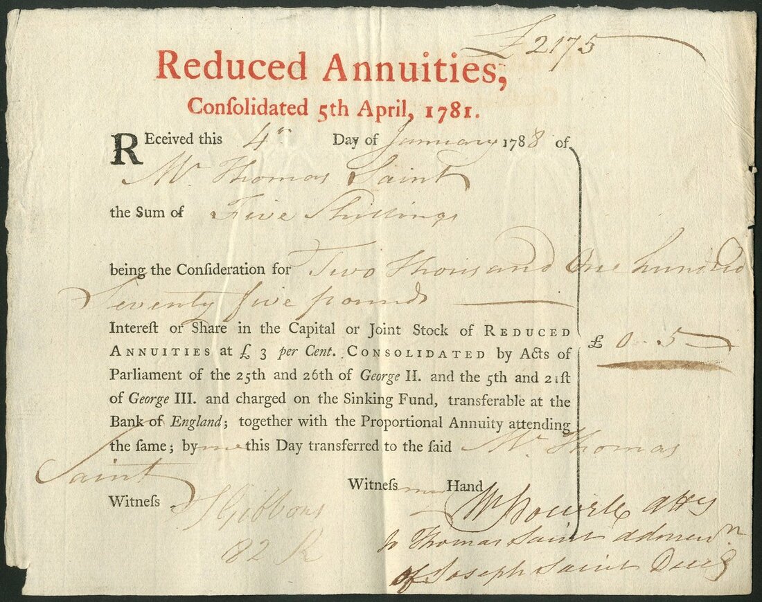 Great Britain: Reduced Annuities, an inscribed stock receipt for £[2125] stock dated 178[8], red and black printing. Formed by consolidation of earlier issues in 1781. Usual spiking damage at lower left corner but a rare early date, VF.