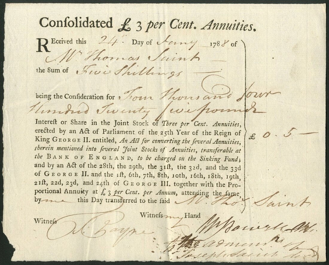 Great Britain: Consolidated £3 per Cent. Annuities, an inscribed stock receipt for £[4425] stock dated 178[8], black printing. Formed by consolidation of earlier issues in 1785 under an Act for 'converting the several Annuities, therein mentioned into several Joint Stocks of Annuities ..'. Usual spiking damage at lower left corner but a rare early date, VF.