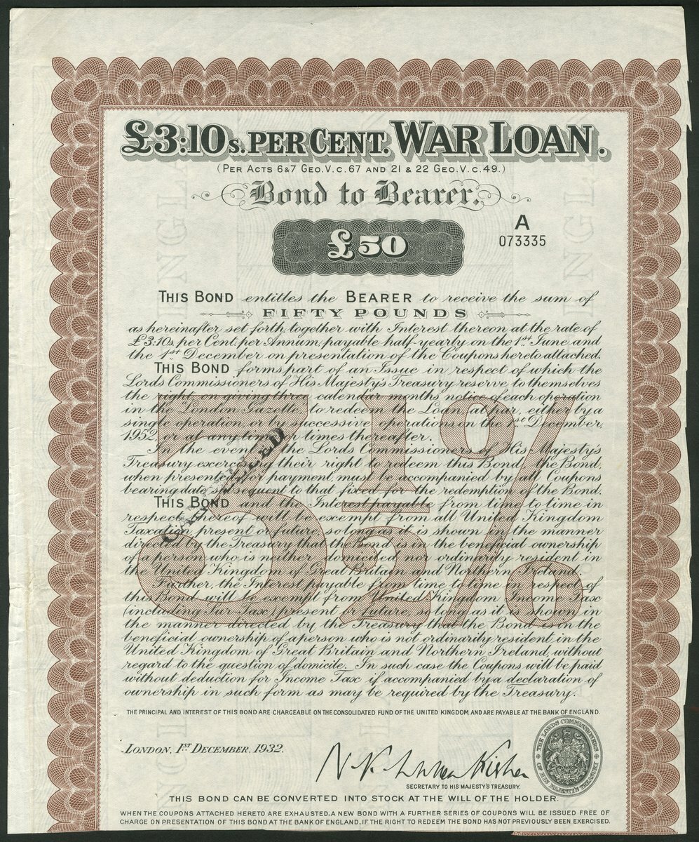 Great Britain: 1932 (December 1st), 3½% War Loan, £50 bond, #073335, facsimile signature of N K Warren-Fisher as Secretary of the Treasury, orange-brown and black, all coupons repaid. Stamped cancelled. GVF.