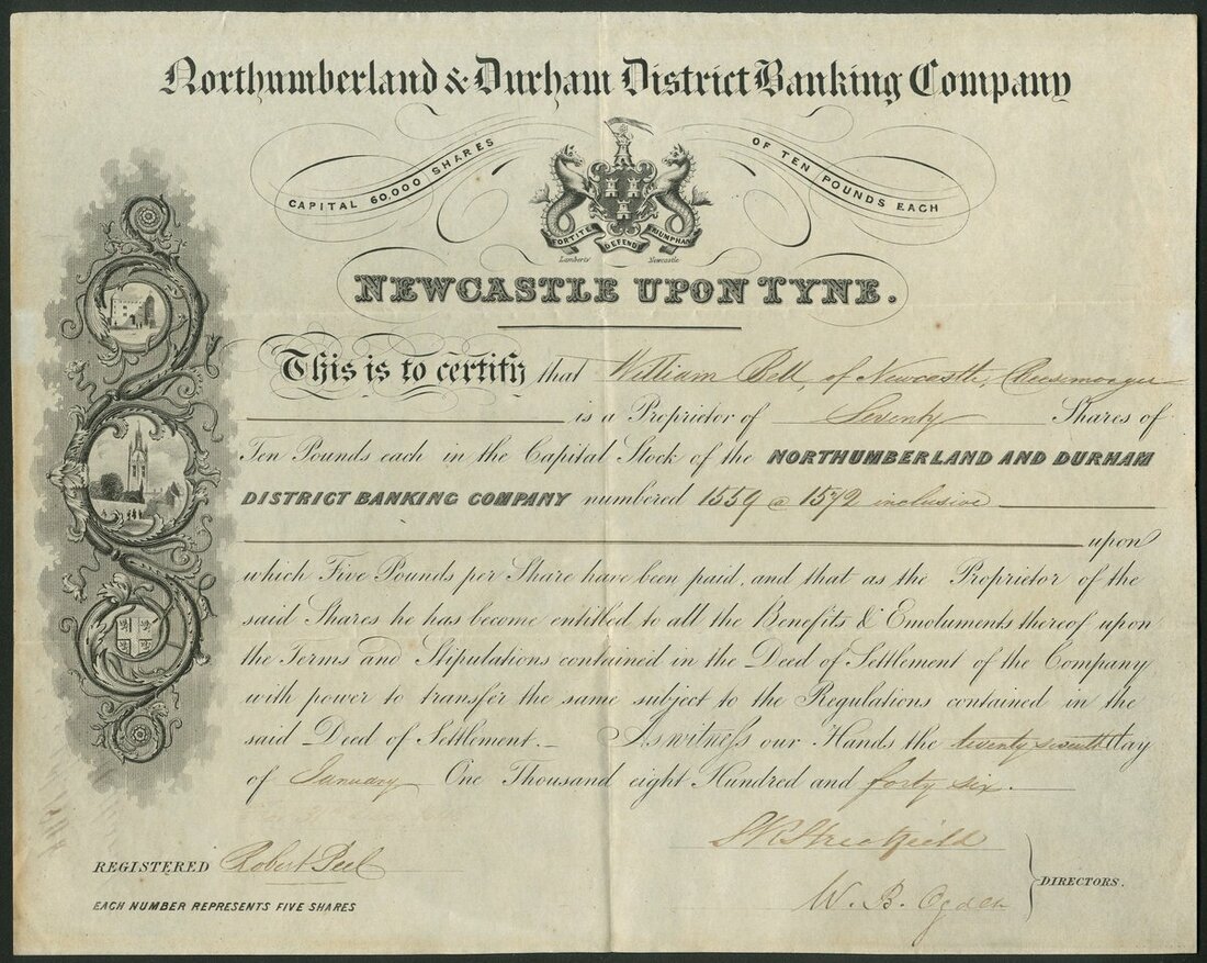 Great Britain: Northumberland & Durham District Banking Company, Newcastle upon Tyne, £10 shares, 18[46], #1559-72, attractive scrollwork at left with small vignettes of buildings and coat of arms, arms top centre, black. Organised in 1836 but failed in 1857. VF and rare.