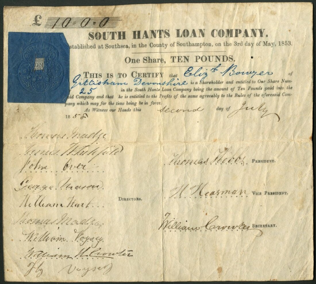 Great Britain: South Hants Loan Company, one share of £10, 18[58], #25, black printing on vellum, blue paper revenue stamp, signed by all 9 directors. Formed at Southsea, near Southamptn in 1853. F-VF and rare. First time seen by the cataloguer.