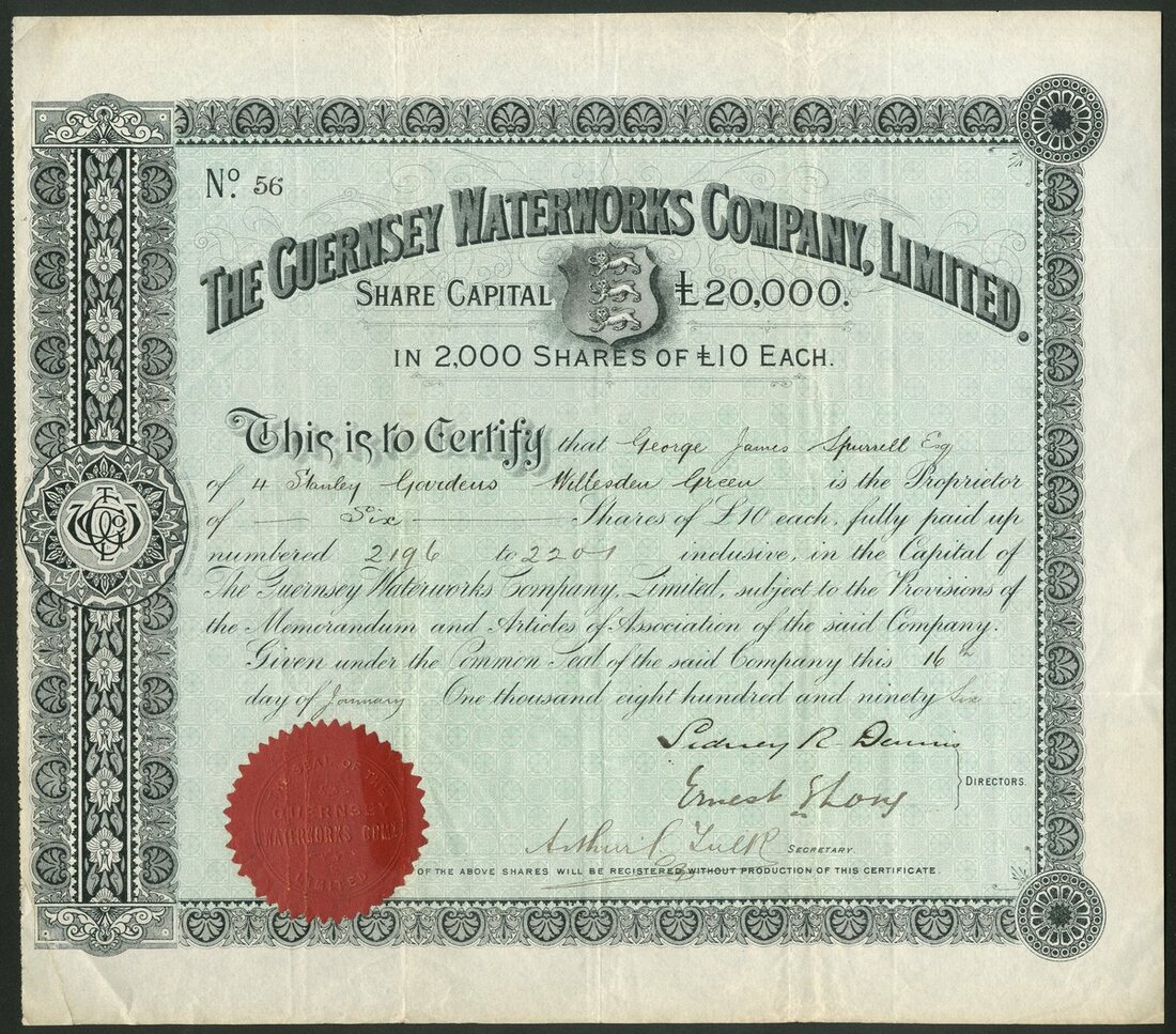 Great Britain: Guernsey Waterworks Company Ltd., £10 shares, 189[6], #56, attractive border, coat of arms in centre, black, green underprint, printed by Waterlow Bros & Layton. VF and very rare.