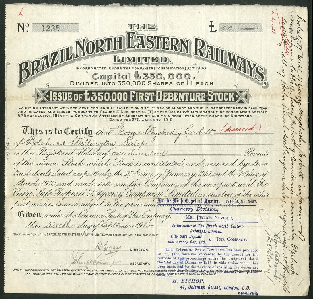 Brazil: Brazil North Eastern Railways Ltd., First debenture stock certificate for £[100], 19[12], #1235, black, handwritten endorsement at left, receivers endorsement below. AVF.