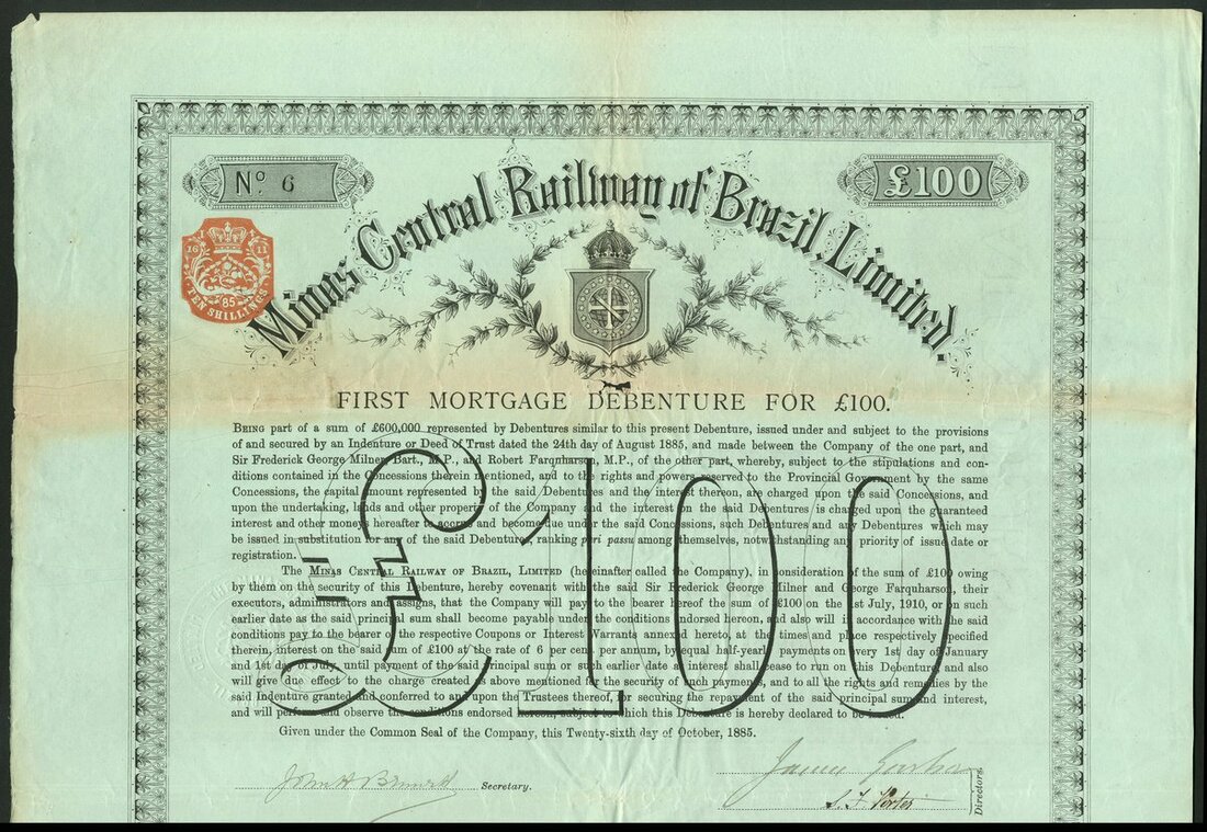 Brazil: Minas Central Railway of Brazil Limited, £100 First Mortgage Debenture, 1885, #6, large format piece with coupons under, Brazilian arms in centre, black on green paper (2 missing). Dicolouration through centre otherwise VF and rare.