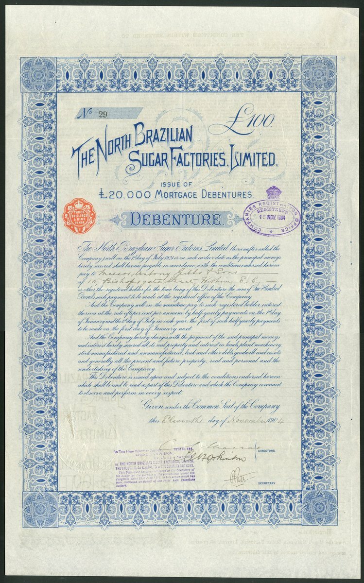 Brazil: North Brazilian Sugar Factories Limited, mortgage debenture for £100, 190[4], #29, of only 200 issued, large format, ornate border, blue. Formed to acquire concessions, some previously owned by Brazilian Sugar Factories Ltd., in 1882, for a total of 15 plants to refine cane sugar. Despite over 100 planters signing contracts to supply the company, only one plant was completed. The company lasted until 1913. VF.