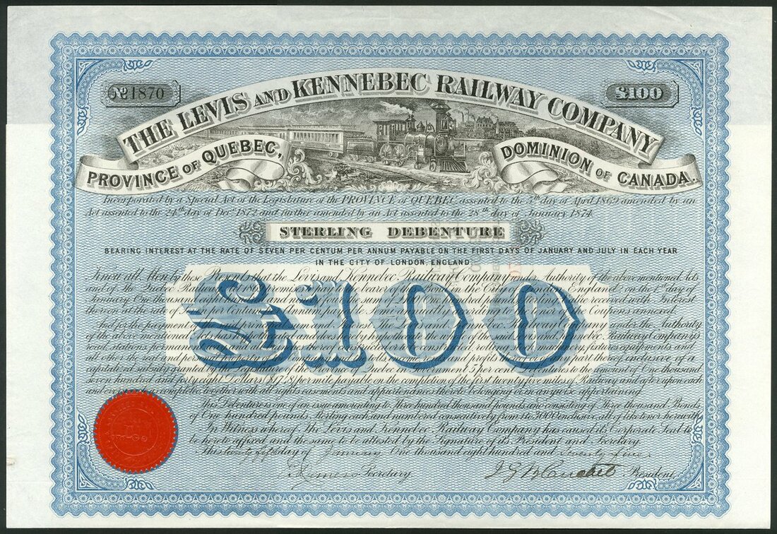 (x) Canada: Levis and Kennebec Railway Company, Quebec, 7% Sterling Debenture for £100, 18[76], #1870, signed by the Hon. J. G. Blanchet as President, speaker of the House of Commons, vignette of steam train, black, heavy ornate blue underprint, red paper seal, with coupons. Incorporated in 1869 to join Levis with the Somerset Railroad giving a connection through to Maine. AEF.