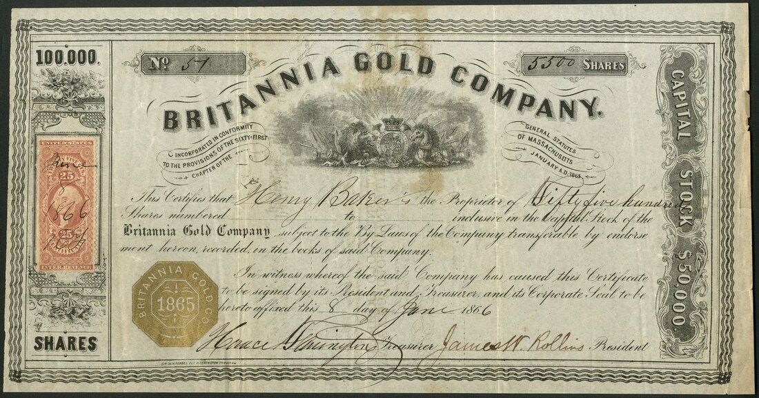 Canada: Britannia Gold Co. (MA), certificate for 50 cent shares, 186[6], #57, vignette below title depicting a Lion and Unicorn flanking a crown, ornate border, black. Mines in Nova Scotia, dissolved in 1872. Staining at top, small tears to right edge, AVF.