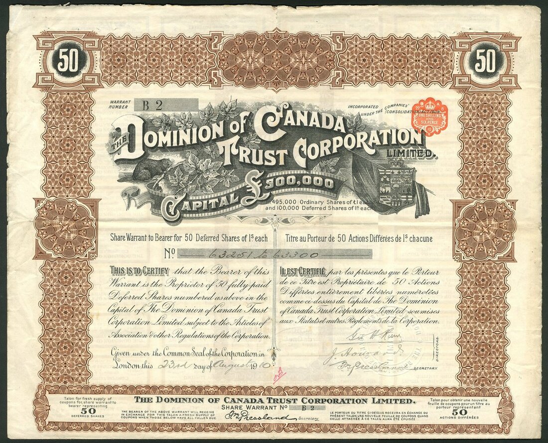 Canada: Dominion of Canada Trust Corporation Ltd., bearer warrant for 50 deferred shares of 1 shilling, London, 19[10], #B2, large format piece with ornate border, beaver gnawing a branch left and coat of arms and flag at right, brown and black, text in English and French, with coupons. VF and scarce.