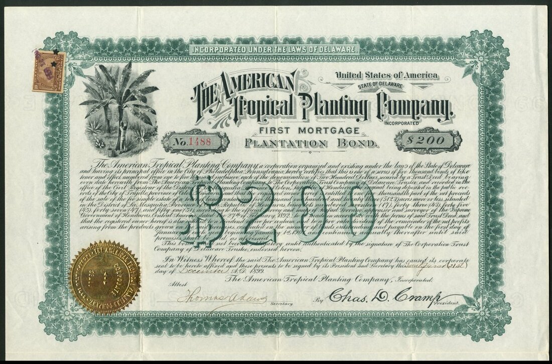 Honduras: American Tropical Planting Company (DE), First Mortgage plantation bond, $200, 1899, #1488, vignette of banana trees top left, green and black, gold seal, with coupons. It would appear that the company was offering parcels of land in this region which historically has been tried before by Gregor MacGregor but without success. The region is one of the most inhospitable in the world so it is no surprise. The Delaware Charter was repealed in 1903. GVF