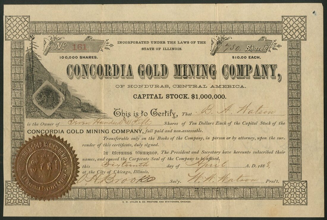 U.S.A.: Concordia Gold Mining Company of Honduras (IL), $10 shares, Chicago 188[8], #161, attractive mountainside vignette at left, black on cream paper and gold seal. VF and scarce.