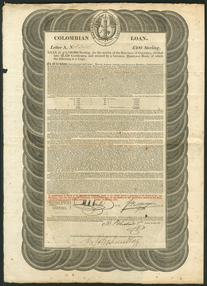 Colombia: 6% Colombian Loan, 1824, bond for £100, Letter A, #8396, attractive engine turned border, black, with coupons, red endorsement relating to payments made by Venezuela, with coupons. Small chip from left edge otherwise VF and rare.