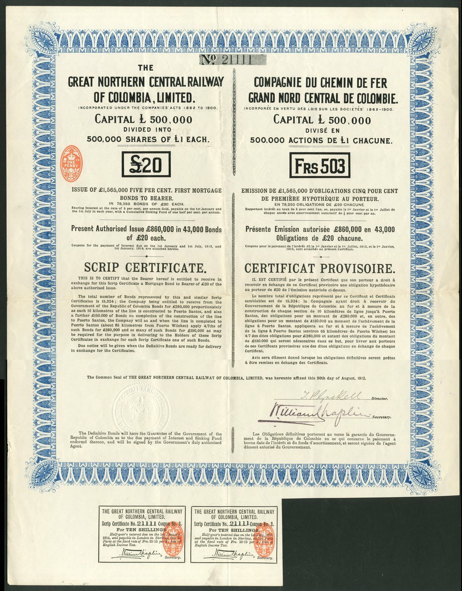Colombia: Great Northern Central Railway of Colombia Ltd., scrip certificate for 1st mortgage bond of £20, 1912, #21111, large format, blue and black, with coupons.