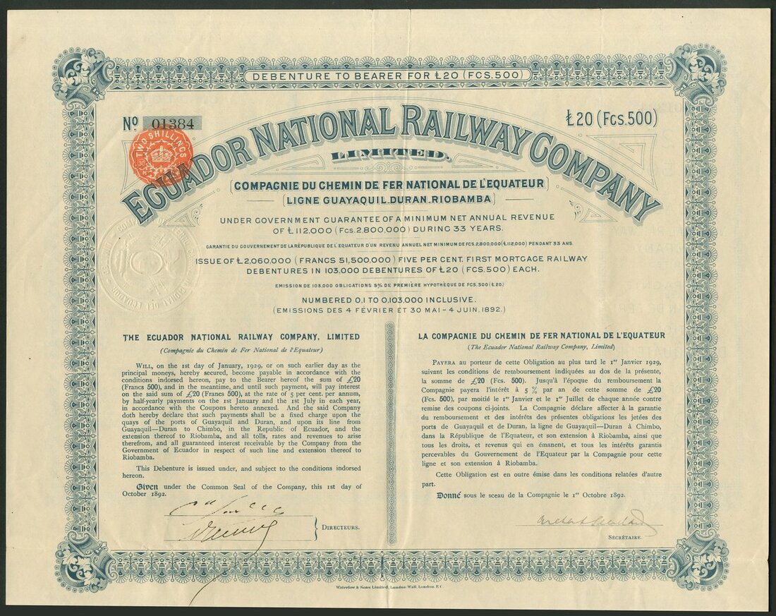Ecuador: Ecuador National Railway Co. Ltd., £20 debenture, 1892, #01384, ornate borders, green, printed by Waterlow & Sons, text in English and French, with coupons. GVF.