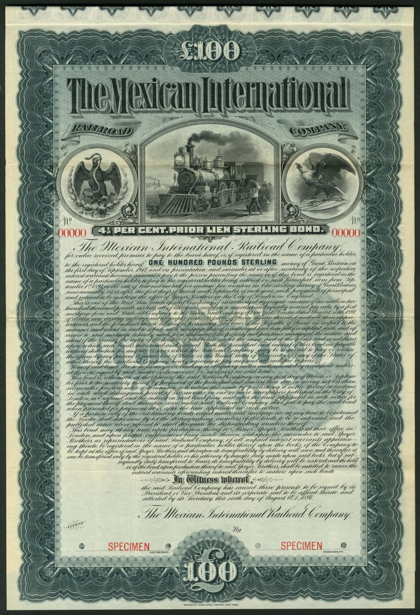 Mexico: Mexican International Railroad Company, 1897 4½% Prior Lien Sterling bond, a specimen bond for £100, printed by ABNCo., steam train in centre flanked by Mexican eagle at left and American bald eagle at right, slate blue and black, with coupons, overprinted SPECIMEN in red in signature areas. Formed in Connecticut in 1882 to link the Southern Pacific to the Mexican Central Railway. Acquired by the government controlled National Railways of Mexico in 1910. GVF and scarce.