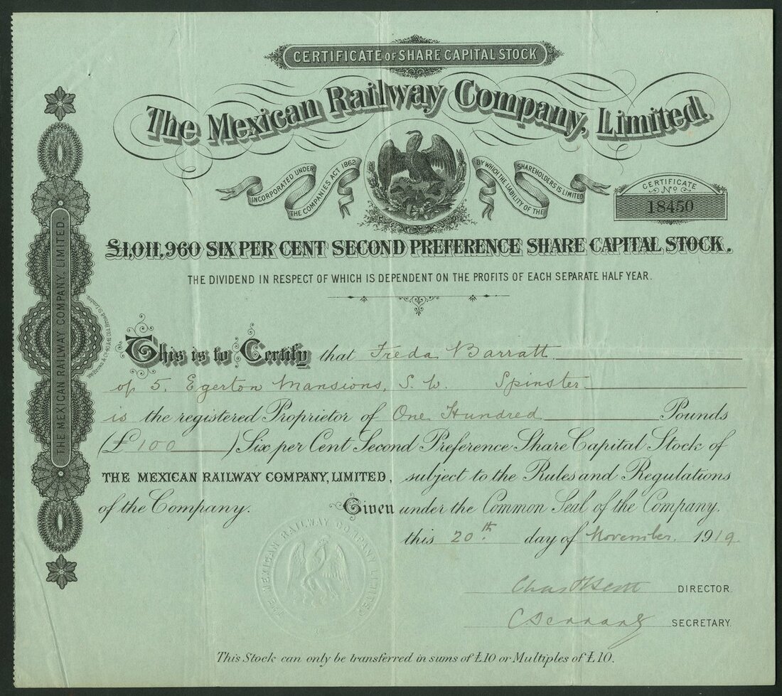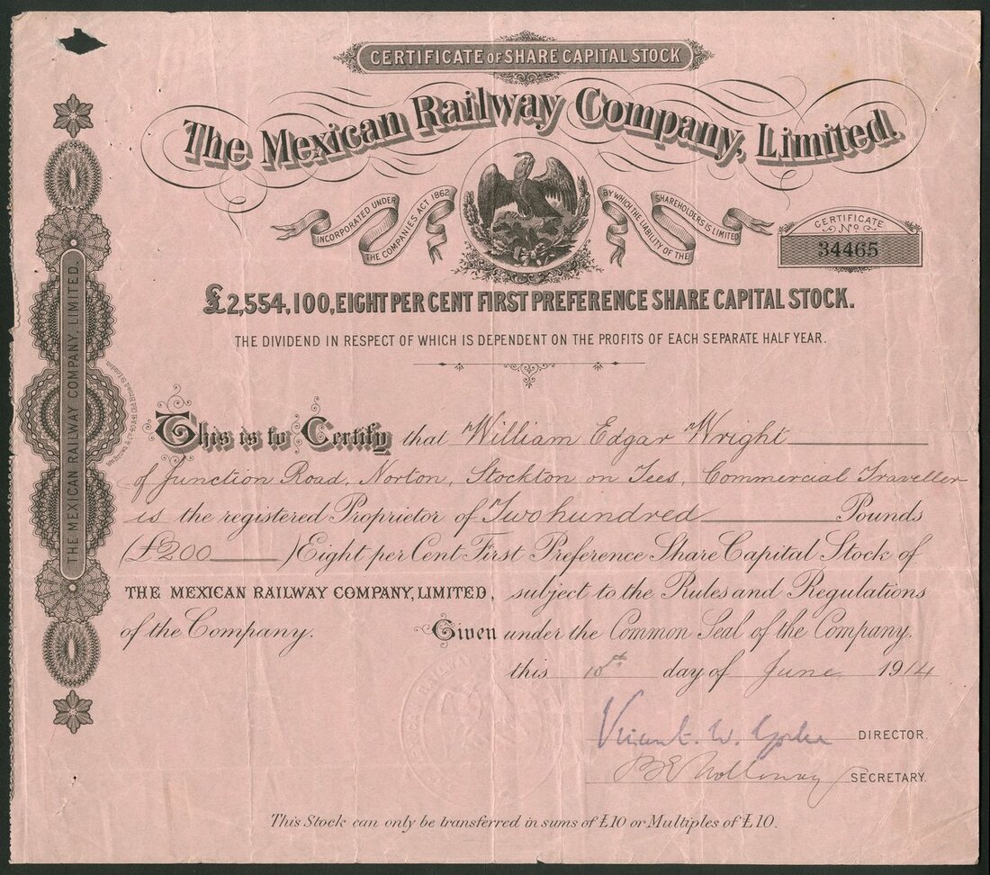 Mexico: Mexican Railway Co. Ltd., a series of 3 certificates for ordinary shares, 19[12], #27268, red; 8% First Preference stock, 19[14], #34465, black on pink paper, and, 6% Second Preference shares, 19[19], #18450, black on green paper, all with Mexican eagle top centre. The second with spike hole top left otherwise all VF and very scarce despite the high serial numbers (3).