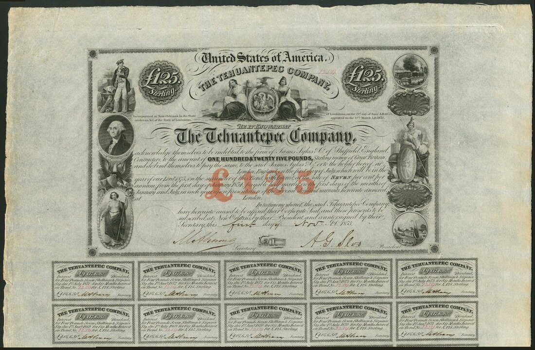 (x) Mexico: Tehuantepec Company7% Loan, 1853, bond for £125, #1254, numerous vignettes, printed by Rawdon Wright Hatch and Edson, black. Incorporated in Louisiana 1852. Under the Treaty of Guadaloupe Hidalgo, Americans secured the right to build a railroad or canal across the Isthmus of Tehuantepec, in southern Mexico. The southerners, who hoped to break up Mexico and turn it into a slave holding territory, were eager to invest in this scheme, but their available cash was unequal to their territorial agenda; few bonds were sold and no transportation facilities were built. EF and rare.