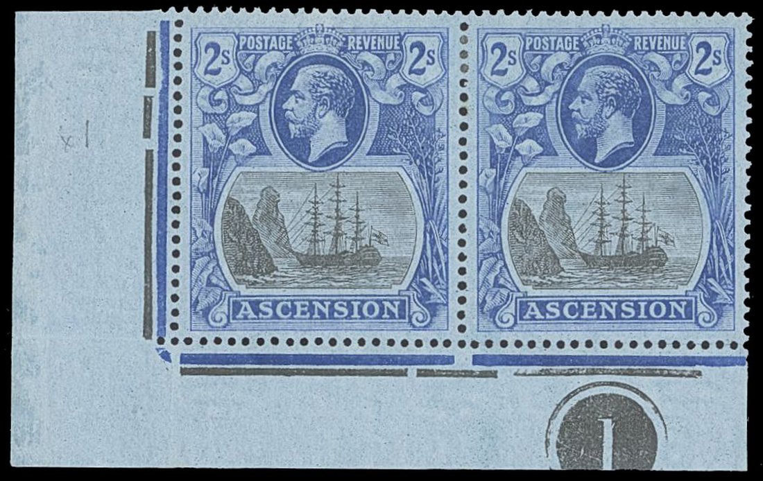 1924-33 2/- grey black and blue horizontal pair from the bottom left of the sheet showing plate number '1', the left stamp showing variety cleft rock, large part original gum, fine. S.G. 19c, £700