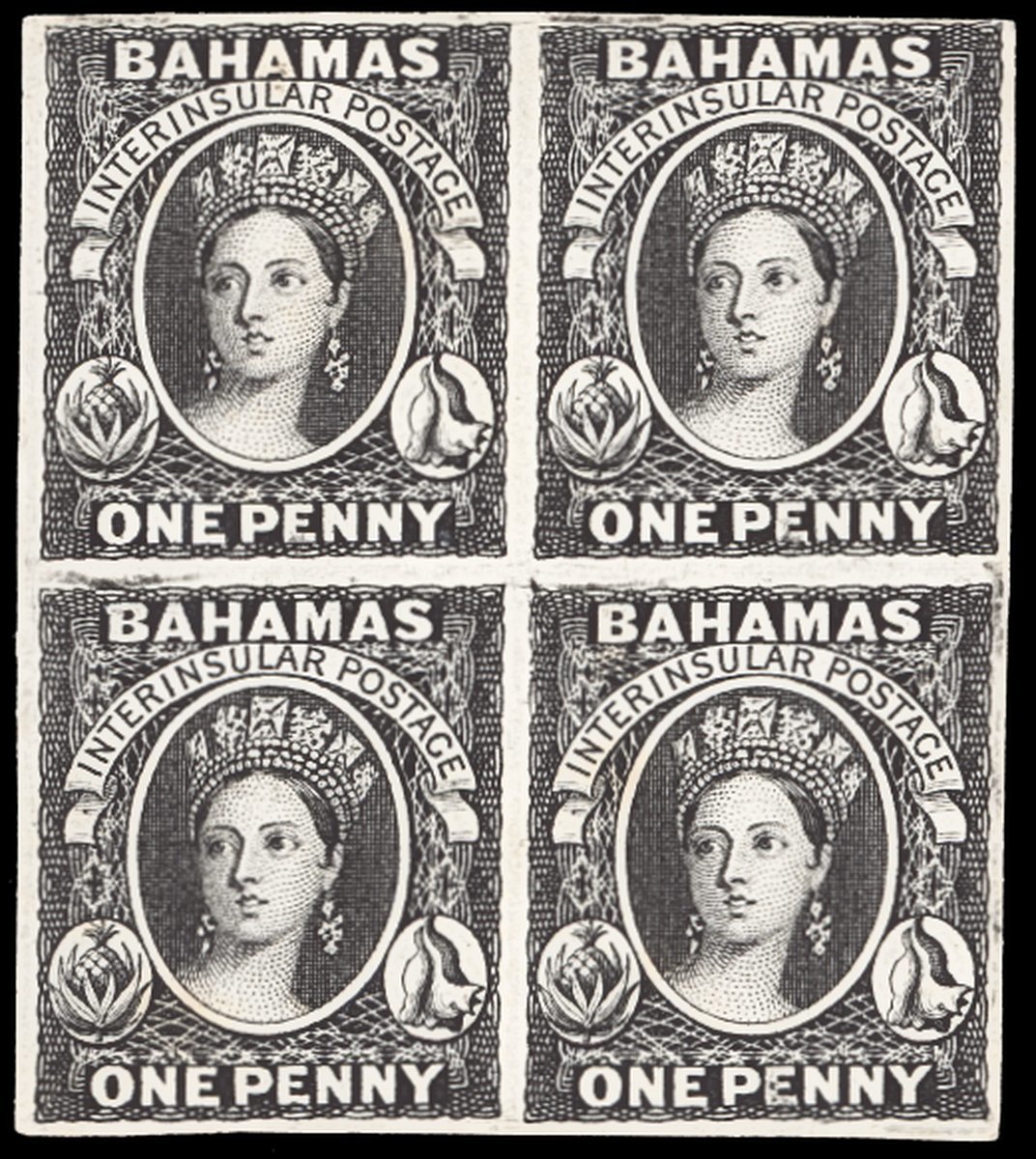 1859-60 1d. imperforate plate proof block of four in black on card with mostly large margins, the lower pair with light horizontal crease not affecting fine appearance. A scarce multiple