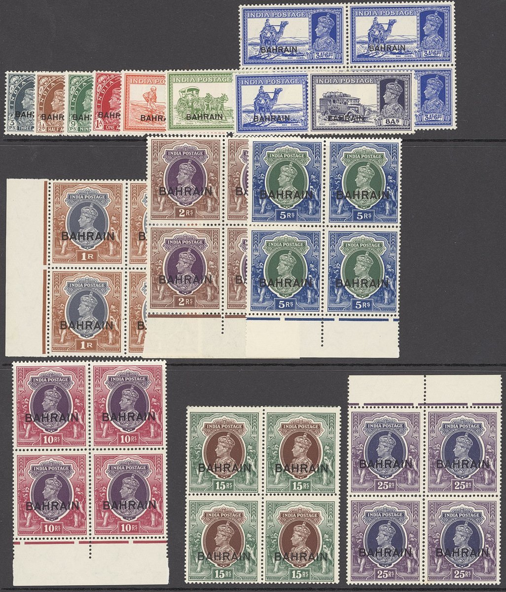 1938-41 part set to 25r. excluding 4a. and 12a., but with 3a.6p., 1r., 2r., 5r., 10r., 15r. (wmk inverted) and 25r. in blocks of four, mostly marginal and mounted in the margin only, otherwise large part original gum, 8a. with small part, 1r. with light gum bend affecting one stamp only and 25r. with light gum tone on perf. A very striking set. S.G. 20-37, £1,900+