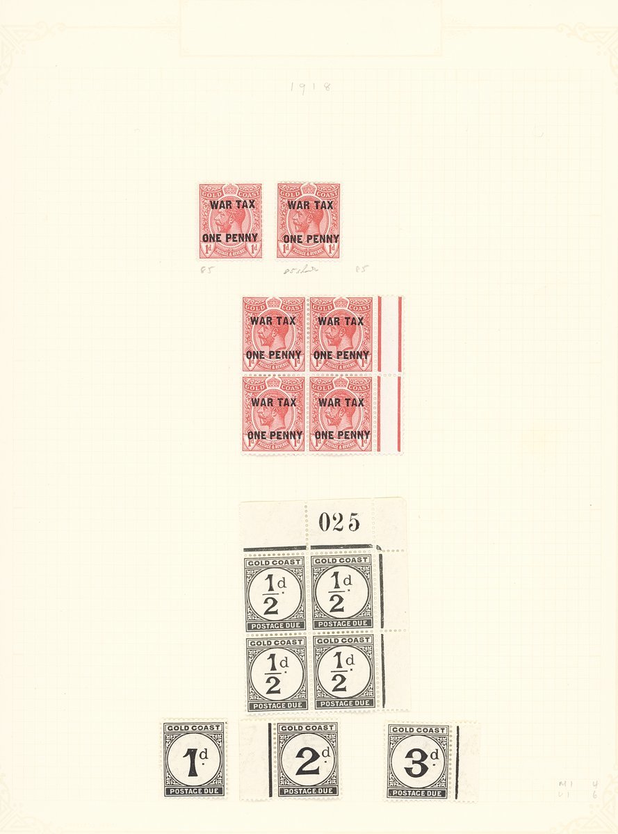 1876-1949 mint collection on album pages including 1876-84 CC ½d. olive-yellow, 1884-91 values to 1/-, 1889-94 10/-, 1902 CA with values to 5/-, 1904-06 MCA set to 2/6d., 1907-13 MCA with 2/6d. and 5/-, War Tax, 1913-21 part set to 10/- with shades a duplication 1/- (9), 5/- (5), 10/- (3)1928 set to 5/-, 1938 set to 10/-, 1948 set to 10/-, 1948 Silver Wedding, Postage Dues including ½d. plate number block of four etc. Cat. £1,500+