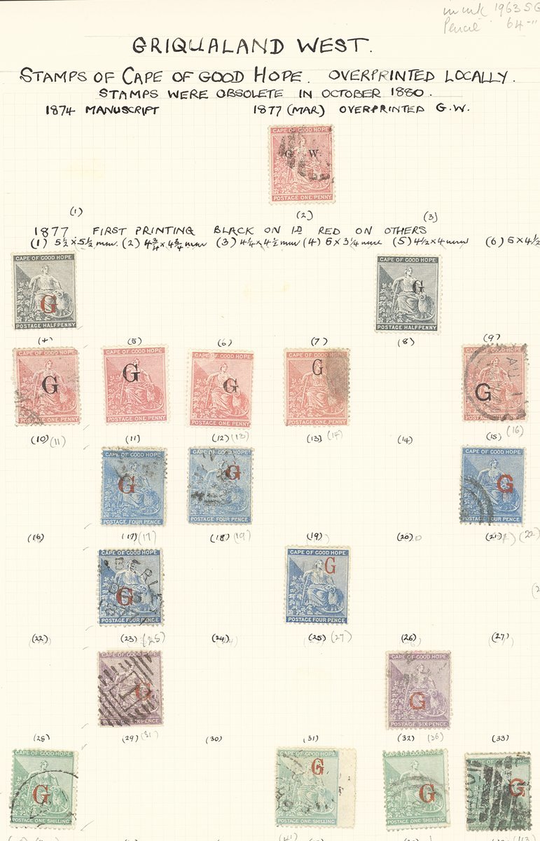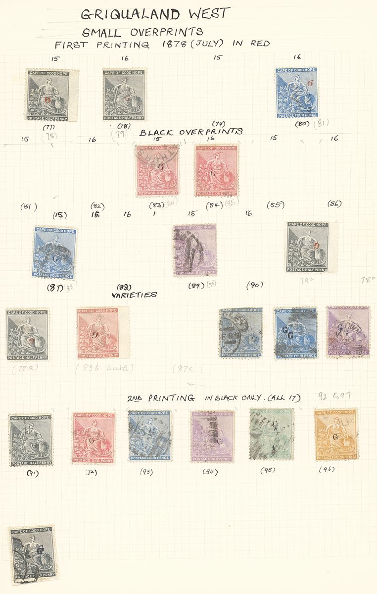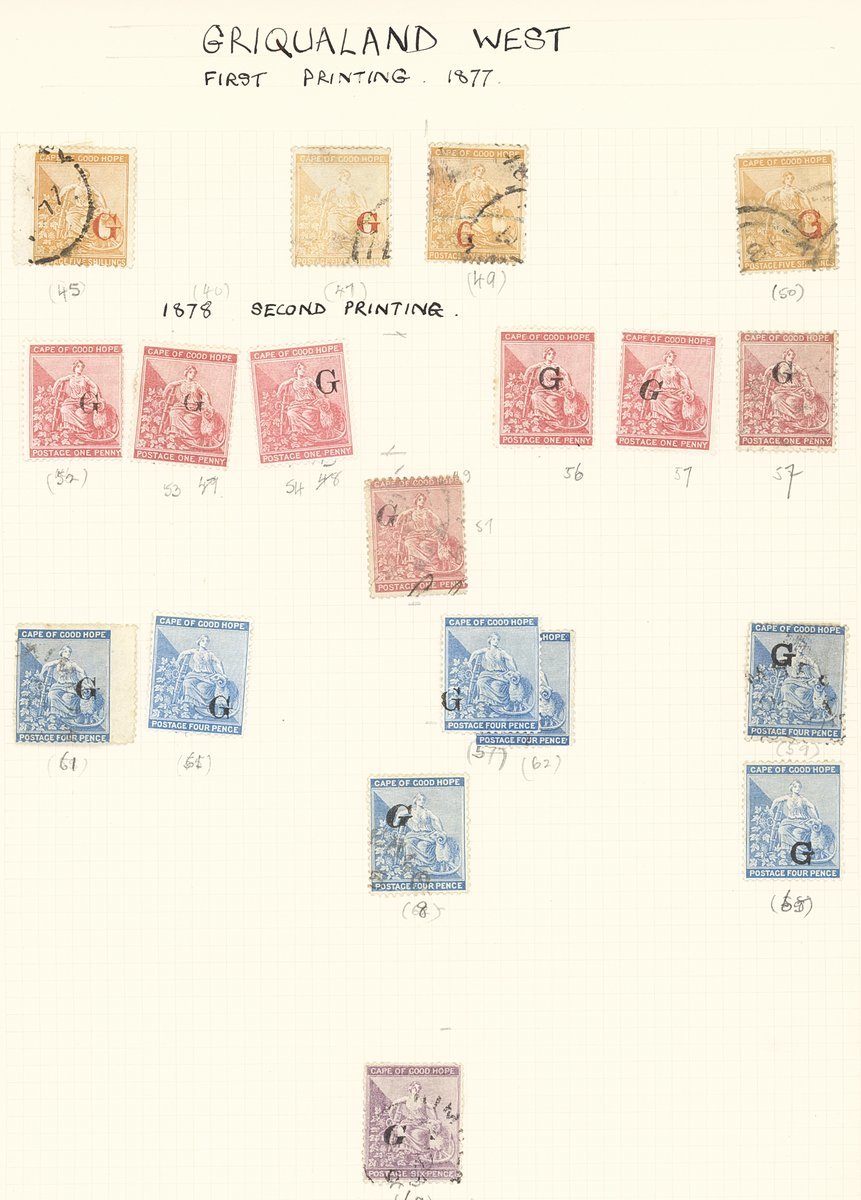 A collection (58) mounted on three pages with some ex Maurice Burrus, including 1877 (Mar.) 1d., 1877-78 First printing unused/mint ½d. Types 1a and 5, 1d. Types 5 and 6, various used to 5/- (4), 1877-78 Second printing unused/mint 1d. (3), 4d. (4), various types to 6d. used, and 1878 small overprints selection to 5/-; mixed condition with some fine