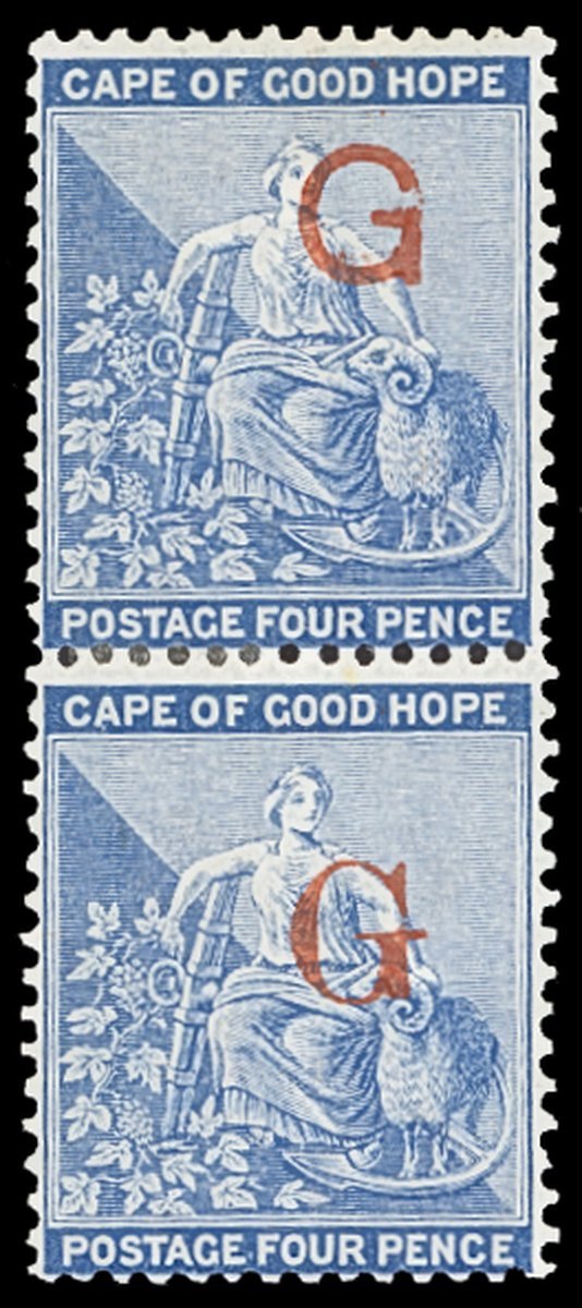 1877-78 1st. Printing in red, 4d. dull blue without frame-line vertical pair showing overprint Types 6 and 1a se-tenant; large part original gum, some slight hinge reinforcement at left, otherwise fresh and fine. S.G. 7a and 7f, £900