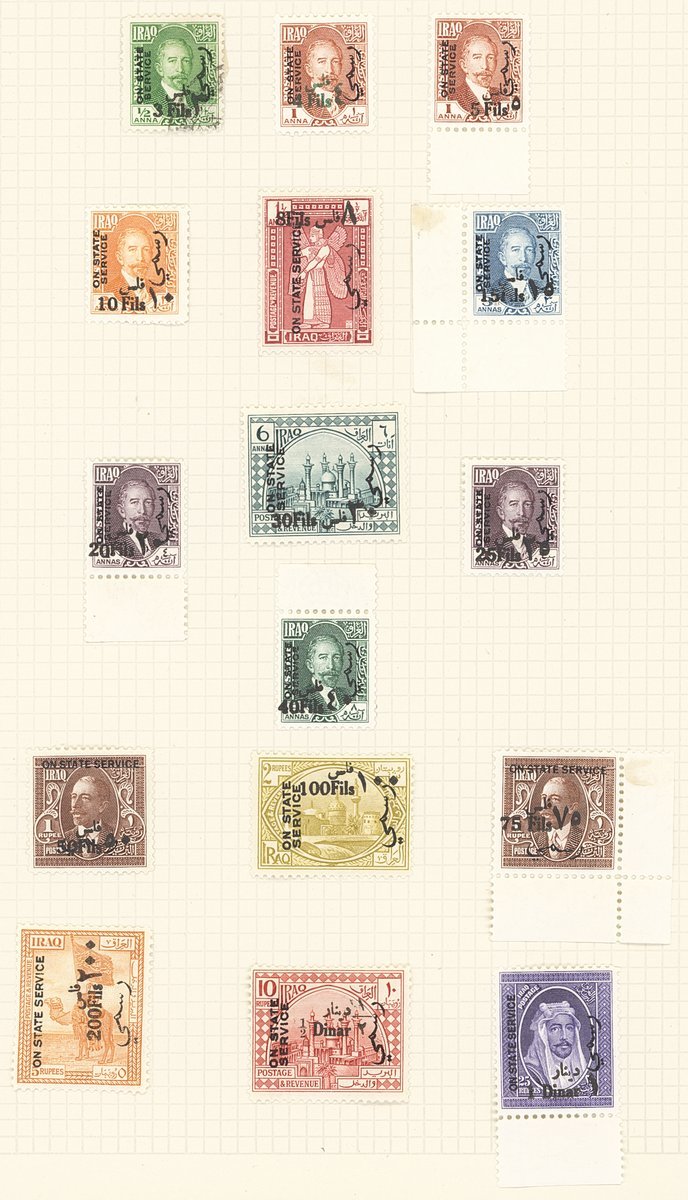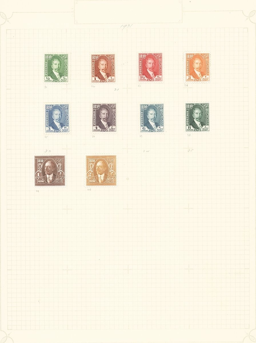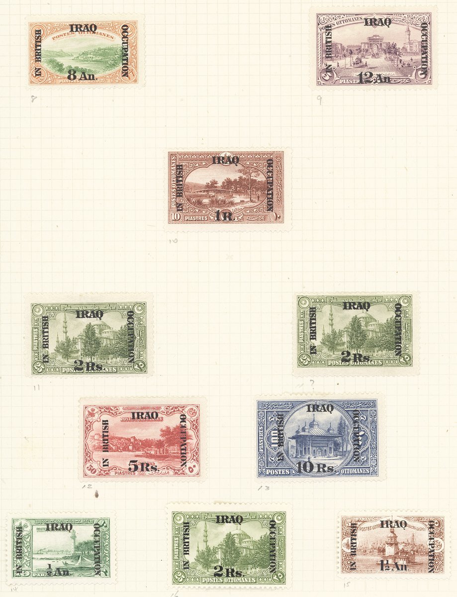1918-22 mint group hinged to pages including 1918-20 set to 10r. on 100p. with small patches of gum removed from previous hinging, 1932 set to 1d., 1934-38 part set to 1d. missing only 1f., 1932 Official set to 1d. on 25r. with many marginal and attractive and 1919 issues for Mosul to 8a. on 10p. Approx. Cat. £850+
