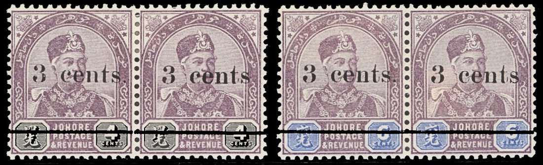 1894 3c. on 4c. and 3c. on 6c. horizontal pairs, each with right hand stamp showing variety no stop, part original gum, 3c. on 6c. with paper adhesion and light gum bend on right hand stamp. S.G. 28a and 30a, £320