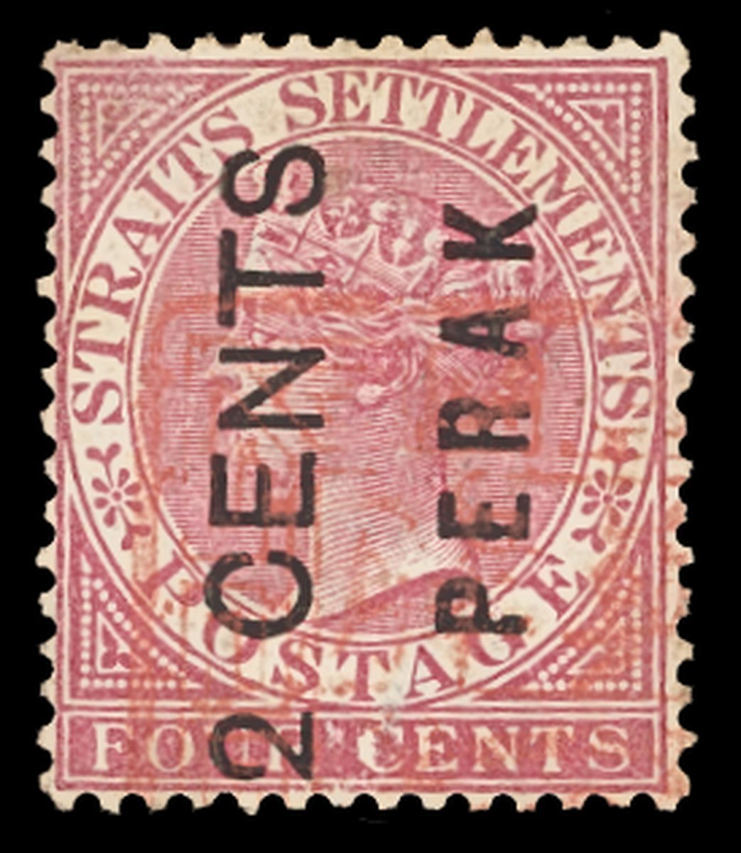 1883 (July) 2c. on 4c. rose, Types 9 + 13, lightly cancelled in red, the odd shortish perf at left, fine used. S.G. 16, £325