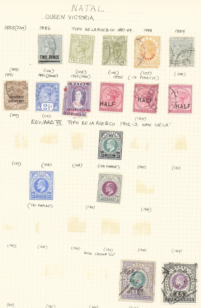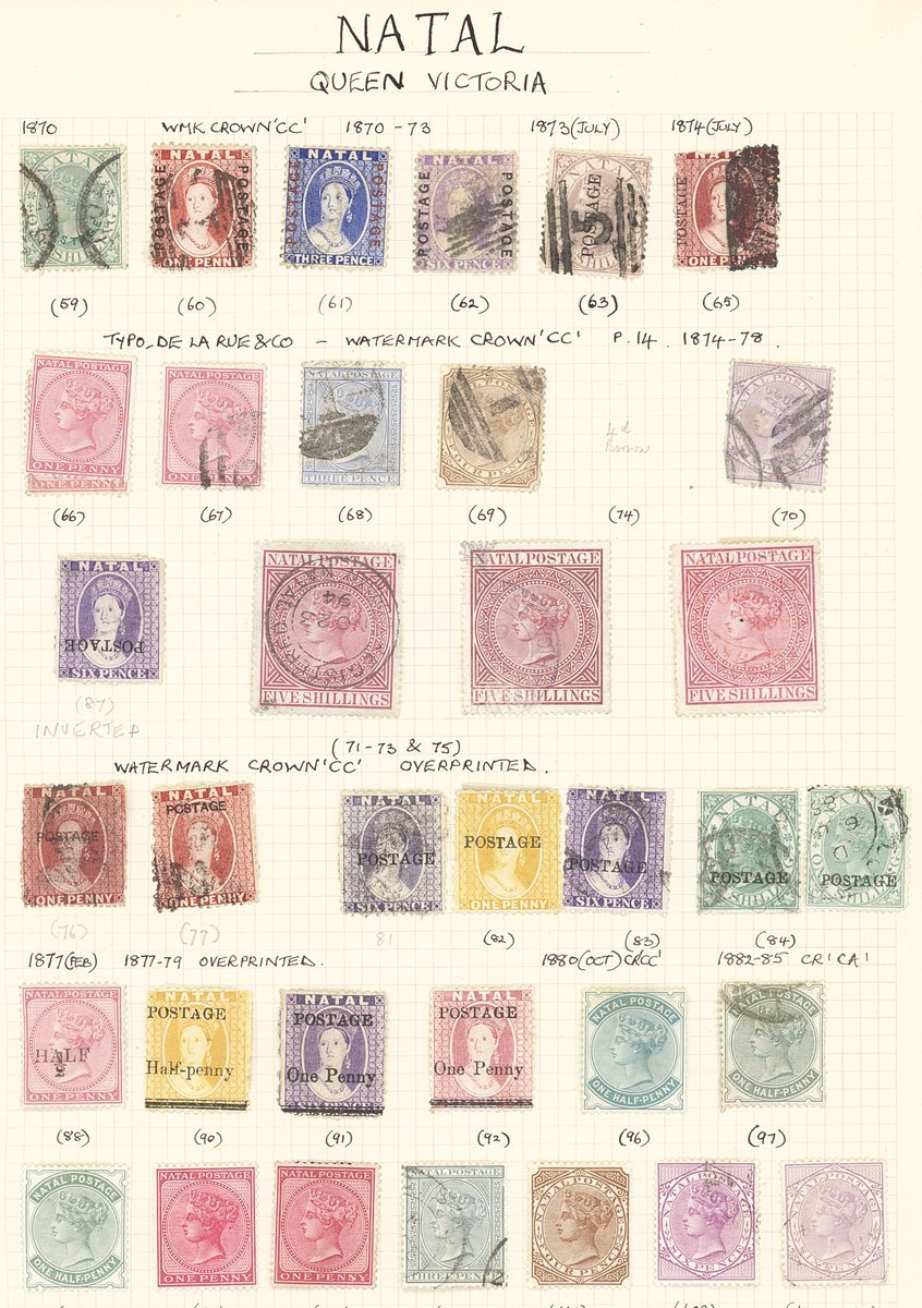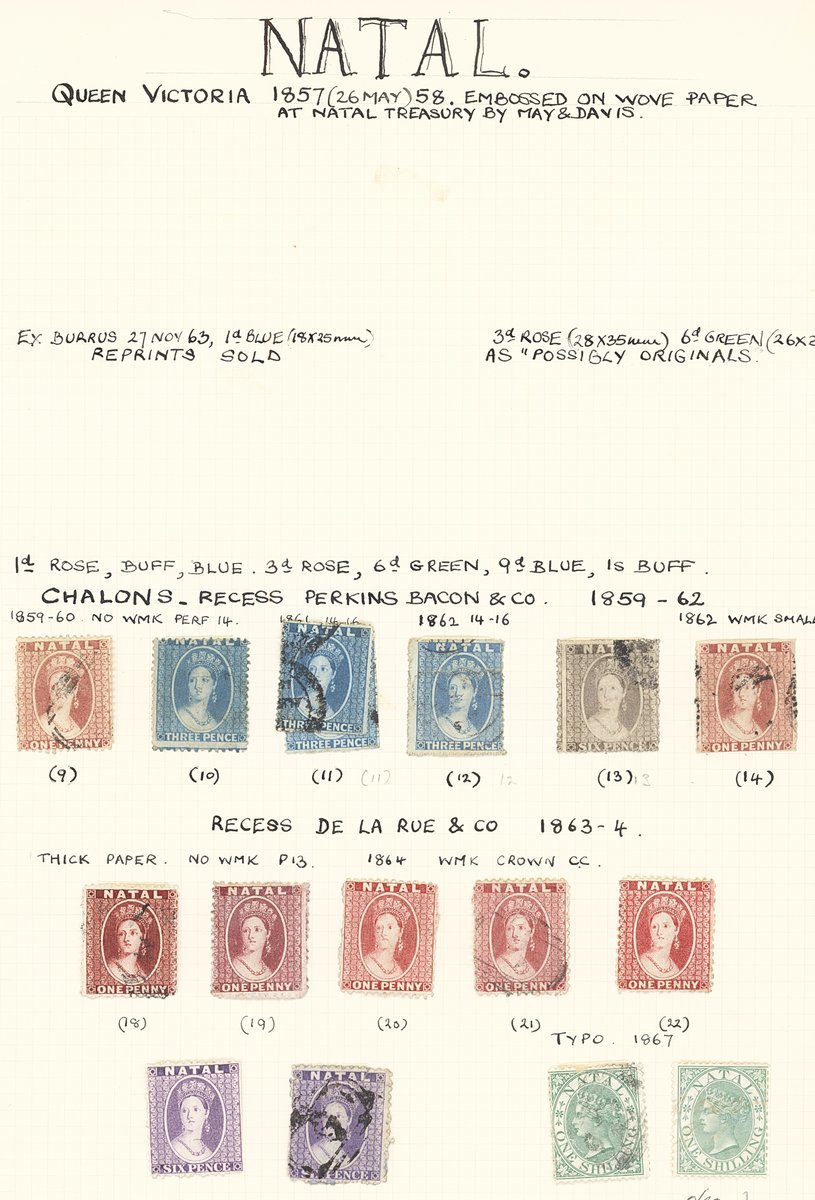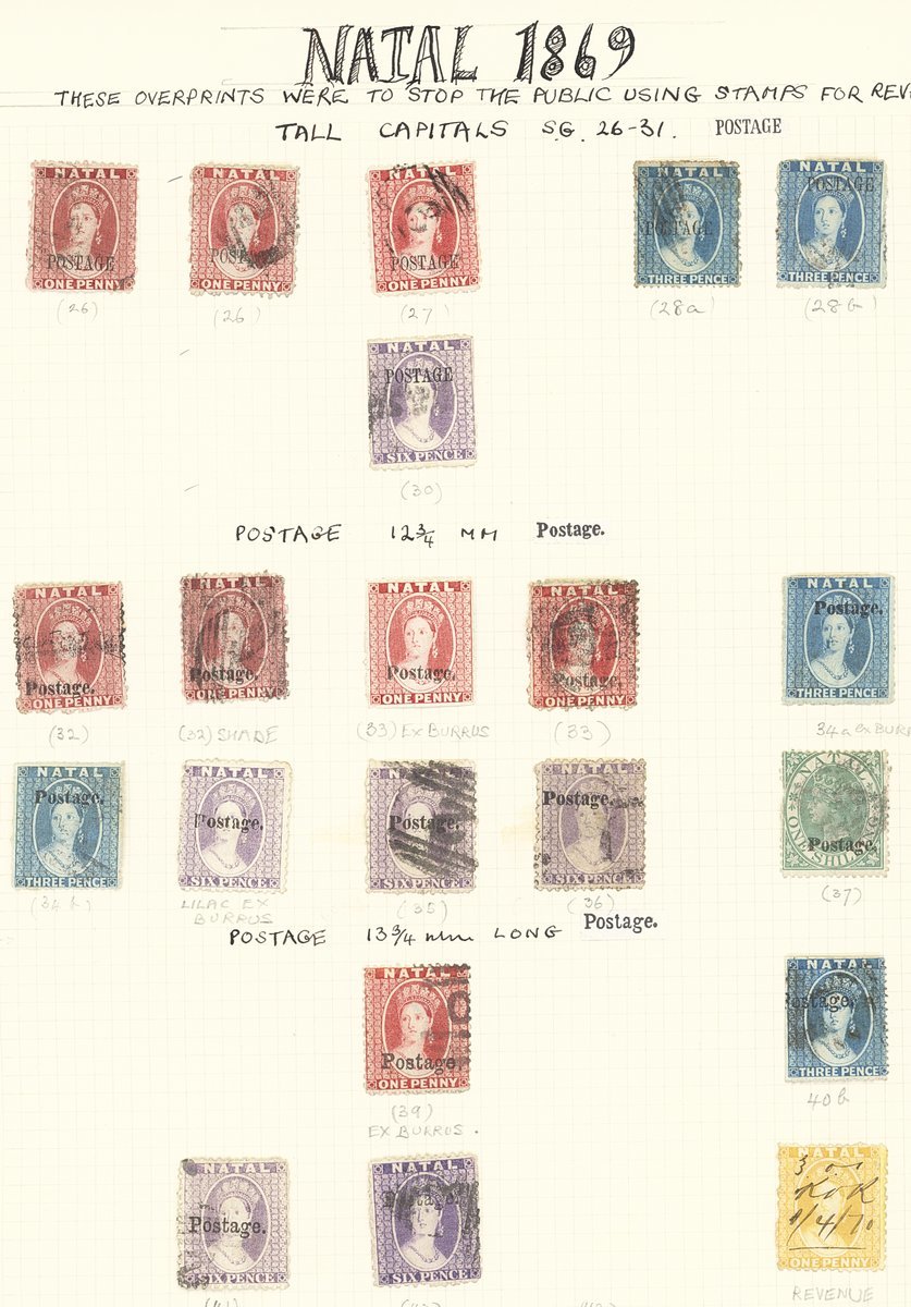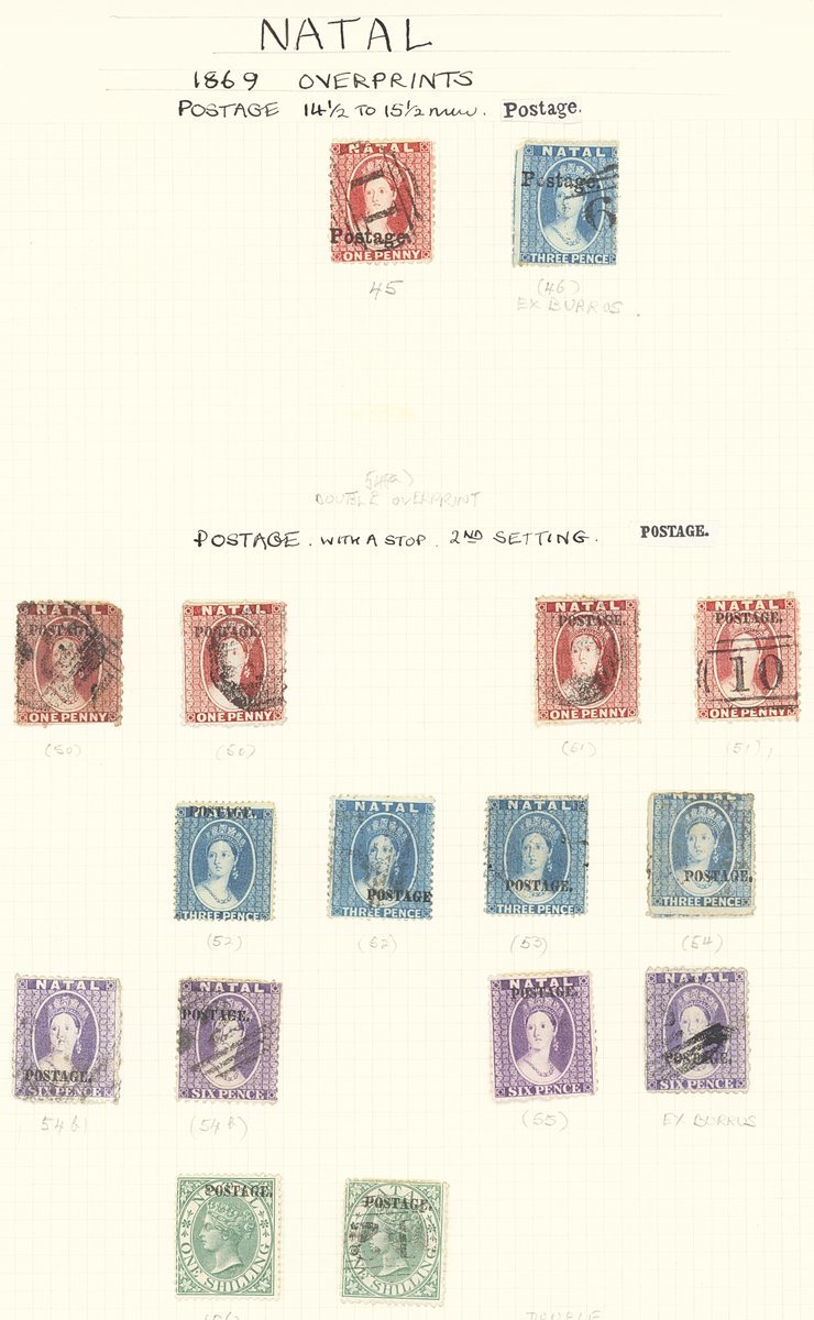 A collection mounted on three pages with some ex Maurice Burrus, including 1859-62 (7 with one 3d. unused), 1863 1d. mint (2), 1863-65 1d. and 6d. lilac mint, and 1869 Postage overprints (37) with Types 7a 1d., 3d. and 6d., 7b 1d., 3d. and 6d. and 7e 3d., 6d. and 1/- unused/mint, and a selection of used with Type 7b 1/- (rare, small defect) and Type e 1/- with overprint double (fiscally cancelled) and unlisted in S.G., 1902-03 set to 2/6d. and 1902 5/- to £1 mint etc.; condition mixed in places though an interesting lot