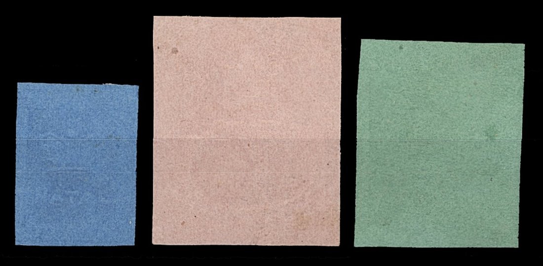 1857-61 1d. blue, 3d. rose and 6d. green, unused with part gum, designs intact and embossing rather flat, otherwise sound and of what we consider to be good colour for originals. Sold as is