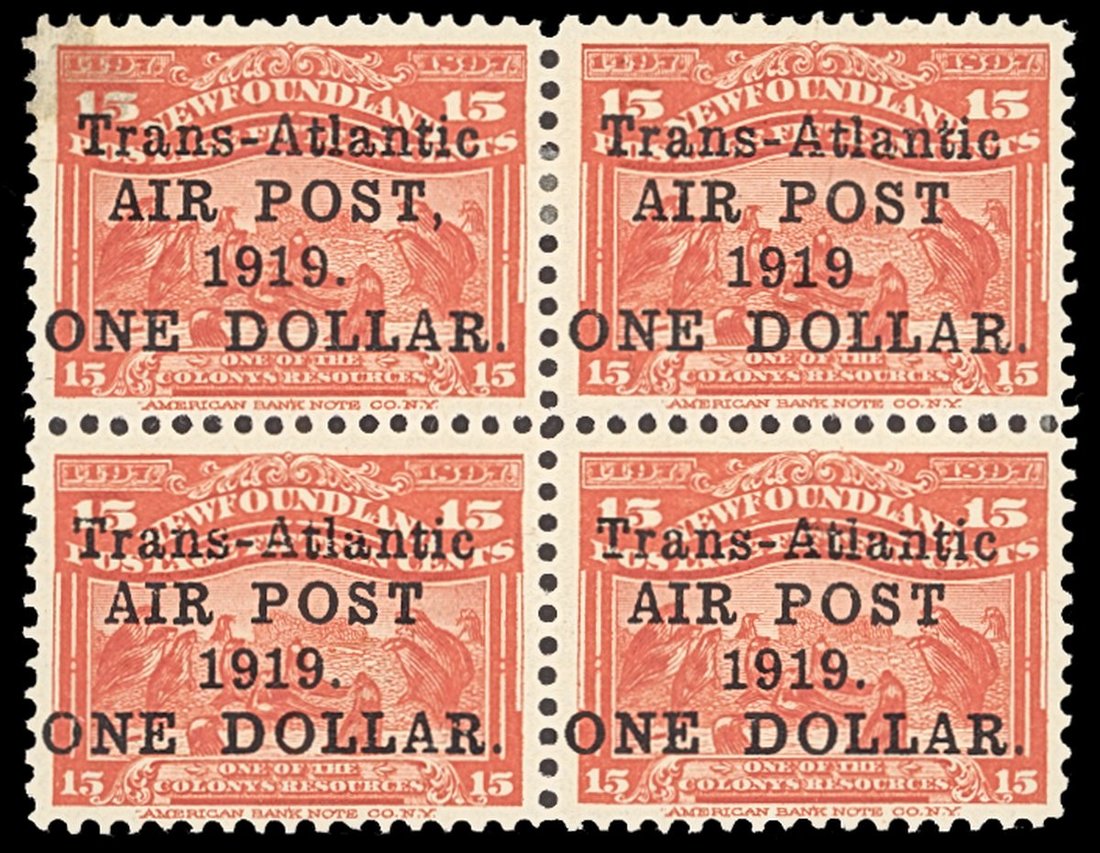 1919 $1 on 15c. bright scarlet block of four, the top right stamp with variety no comma after '