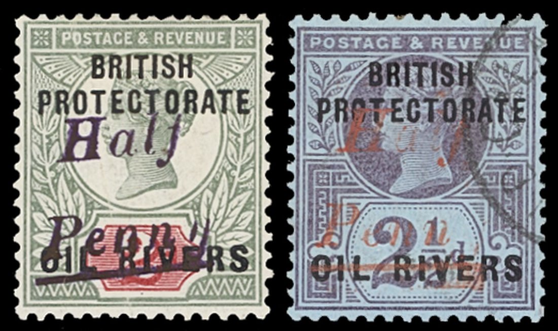 ½d. (Type 7) in violet on 2d. green and carmine (diagonal crease), mint, and in carmine on 2½d. purple on blue, used. S.G. 20-21, £655