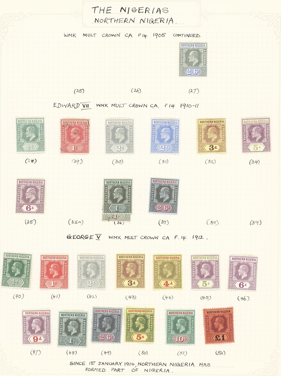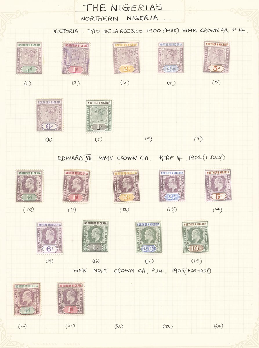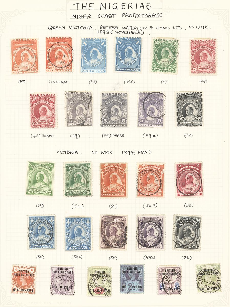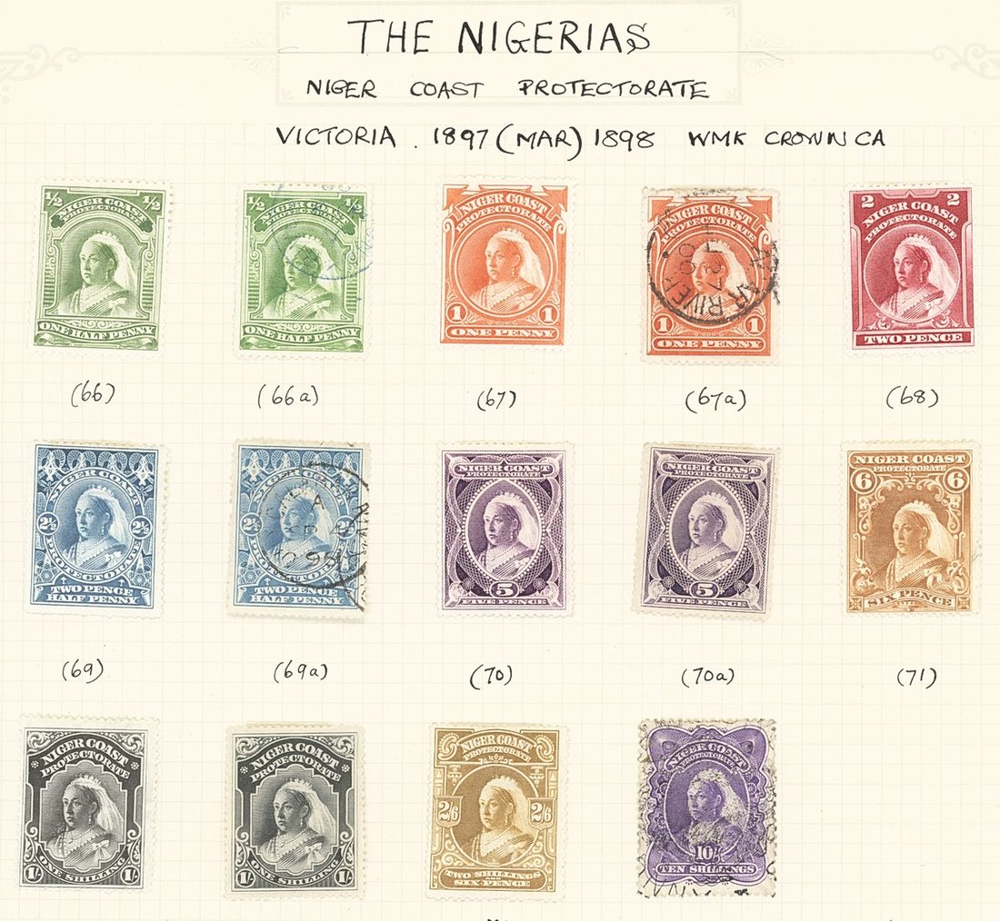 1893-12 mainly mint collection on album pages with Oil Rivers 1892-94 set to 1/- used, Niger Coast 1894 set to 1/- mint/used, 1894 to 1/- mint/used, 1897 set to 10/- mint/used, Northern Nigeria 1900 set to 1/-, 1902 set to 10/-, 1905-07 2/6d., 1910-11 with values to 2/6d. and 1912 set to £1