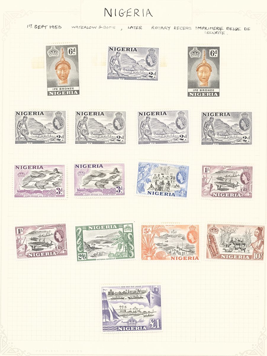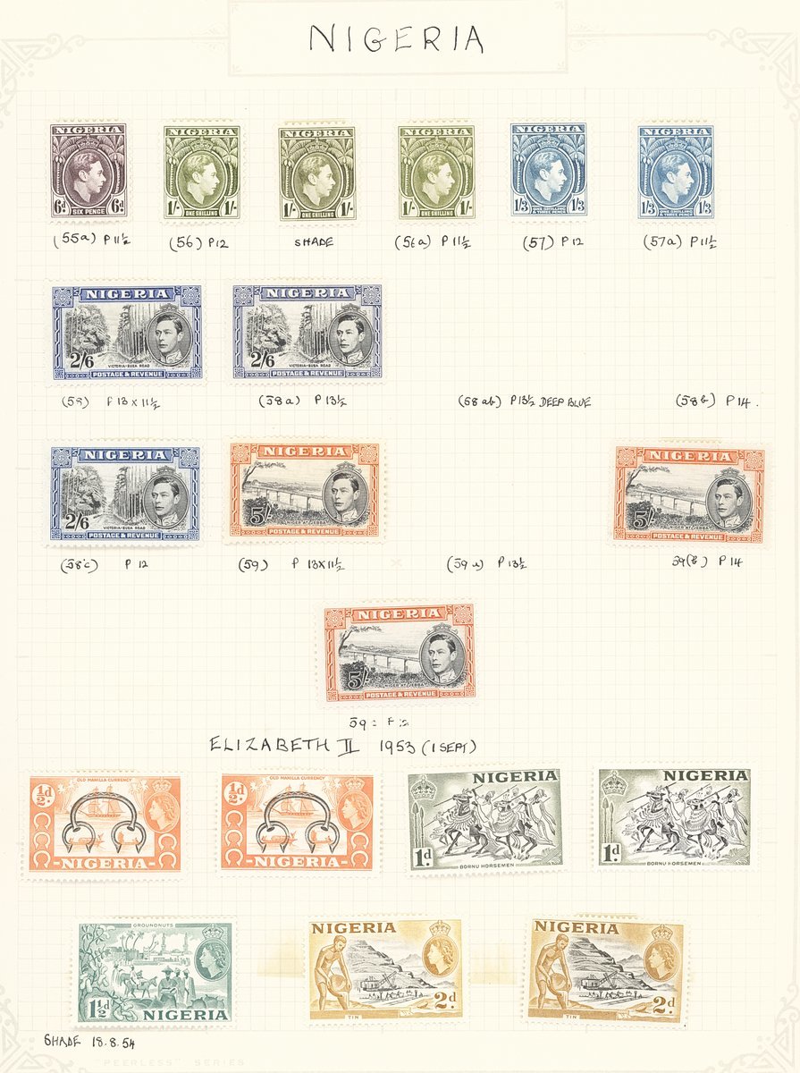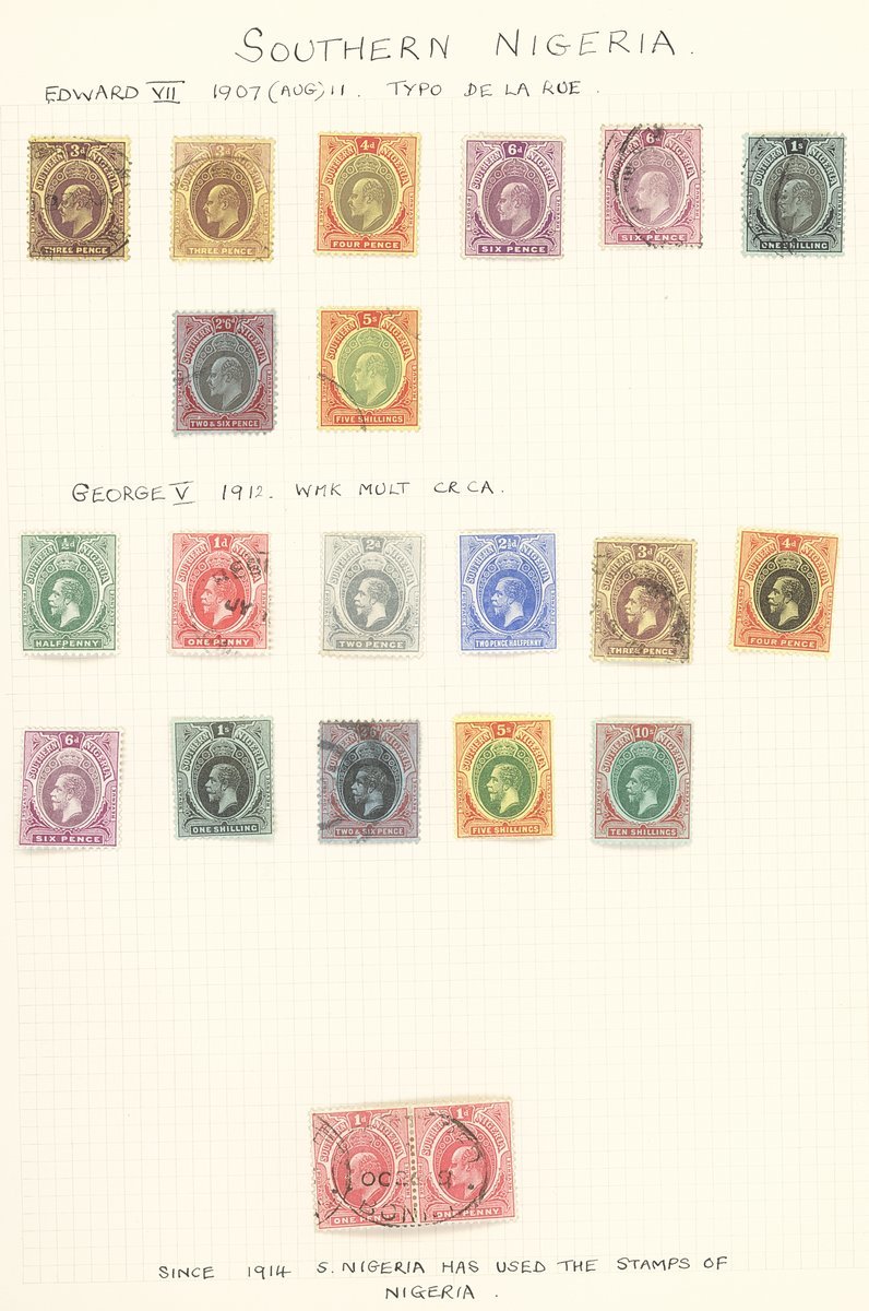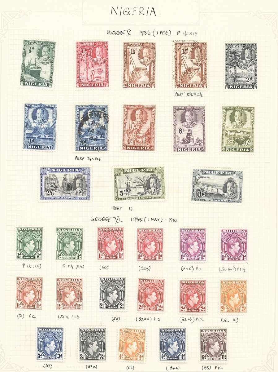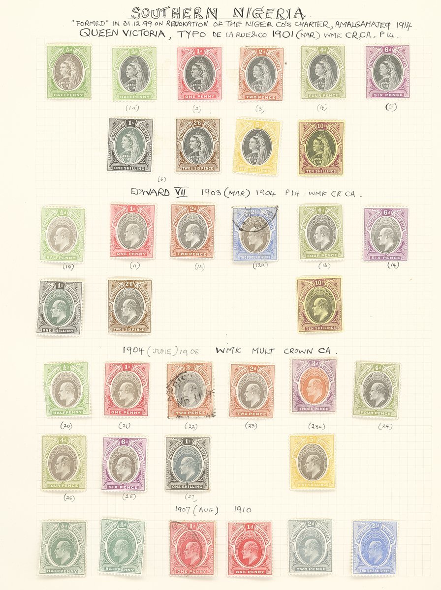 1901-61 mainly mint collection on album pages including Southern Nigeria with 1901-02 set to 10/-, 1903-04 with values to 10/-, 1904-08 values to 5/- and 1912 MCA to 10/-, Nigeria with 1914-29 MCA virtually complete set of thirty to £1 (Die II) including 3d. (5), 4d. (5), 1/- (6), 5/- (2) and 10/- (2), 1921-32 Script to 5/- with a few additional shades, 1936 set to 10/-, 1938-51 set to 5/- including perf variations, 1953 set to £1, etc. Cat. £1,800+